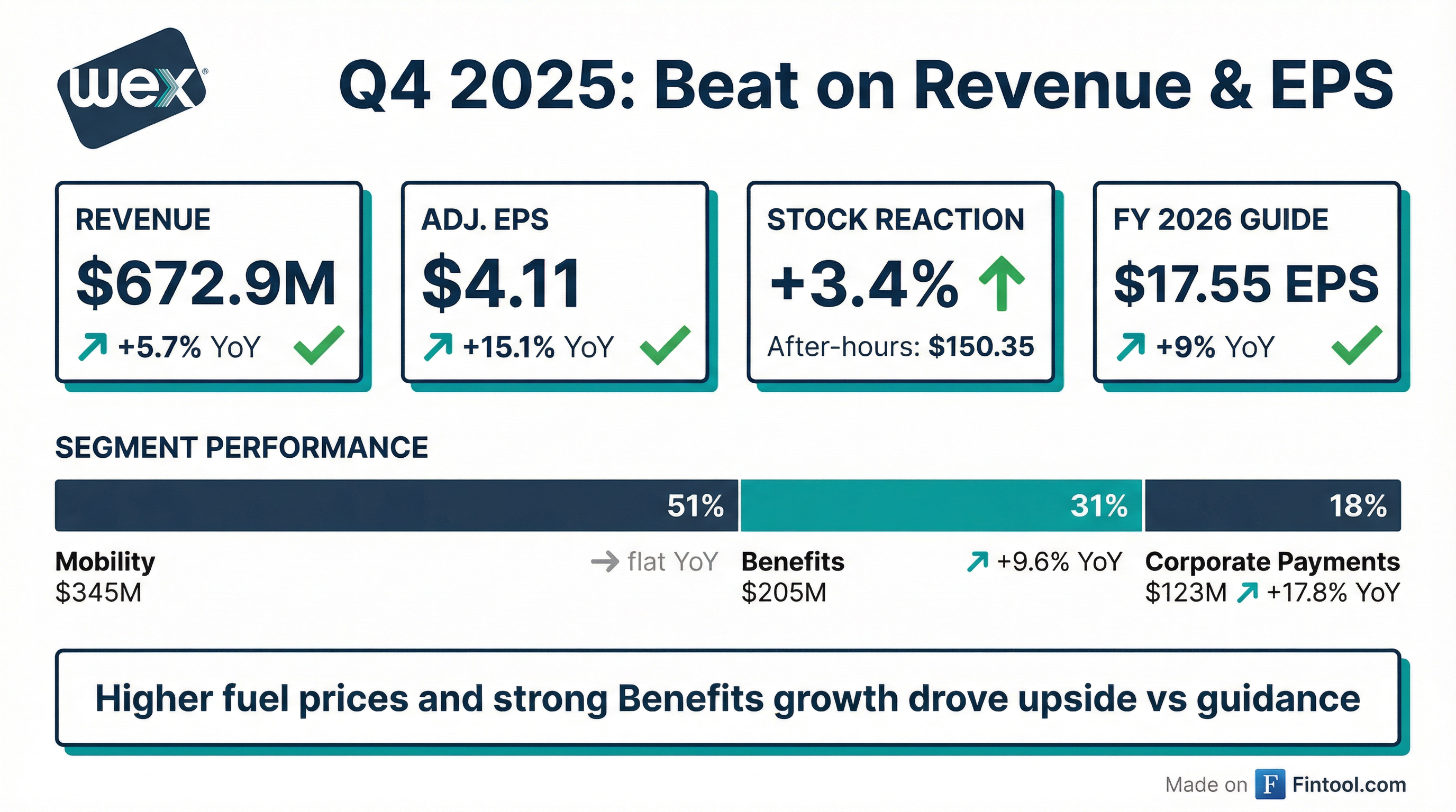 - WEX reported Q4 2025 revenue of $672.9 million, an increase of 5.7% compared to the prior year, and full year 2025 revenue of $2.66 billion, up 1.2%.