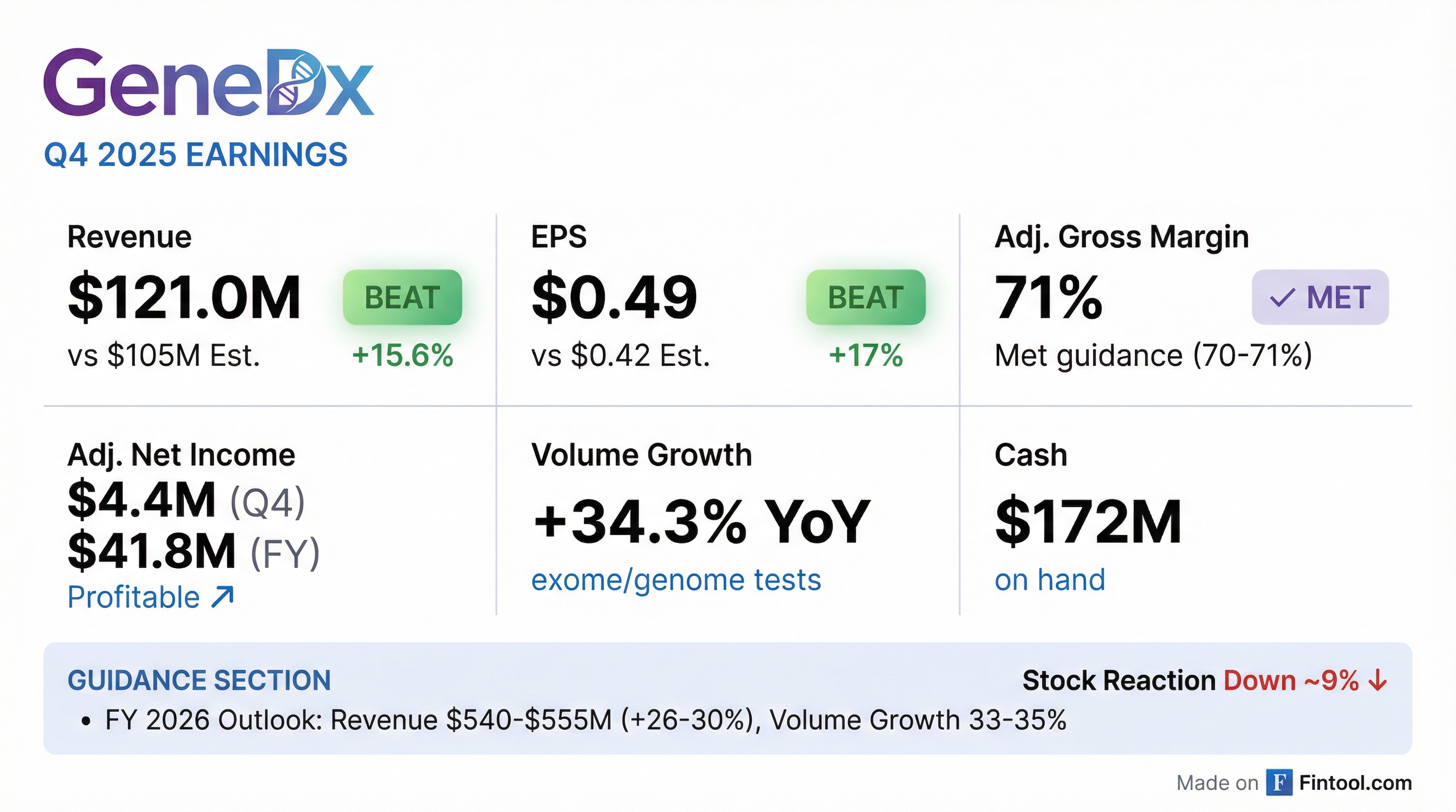 - GeneDx achieved a positive adjusted net income and an adjusted gross margin of 71% for FY 2025, with guidance of at least 70% for FY 2026.