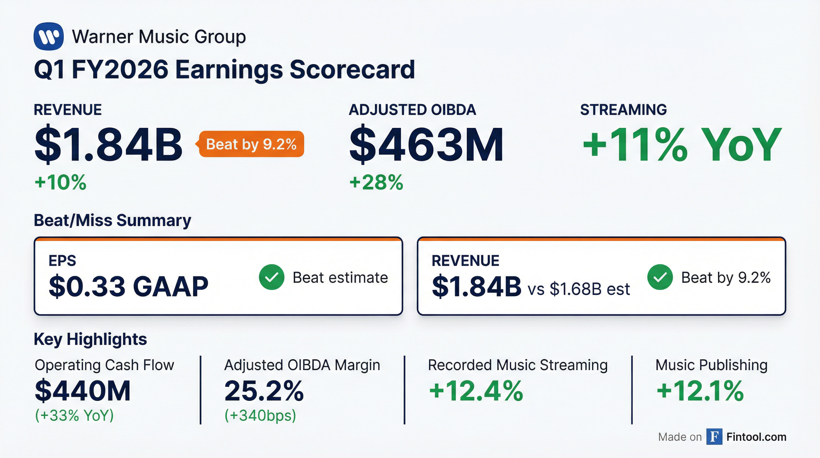 • Warner Music Group reported a 13% increase in total revenue and 8.4% growth in adjusted recorded music subscription streaming for Q4 2025, alongside a 12% rise in adjusted OIBDA. The company also achieved global market share gains, including a 0.6 percentage point increase in the U.S. and a 6 percentage point jump in its Spotify Top 200 share compared to fiscal 2024.