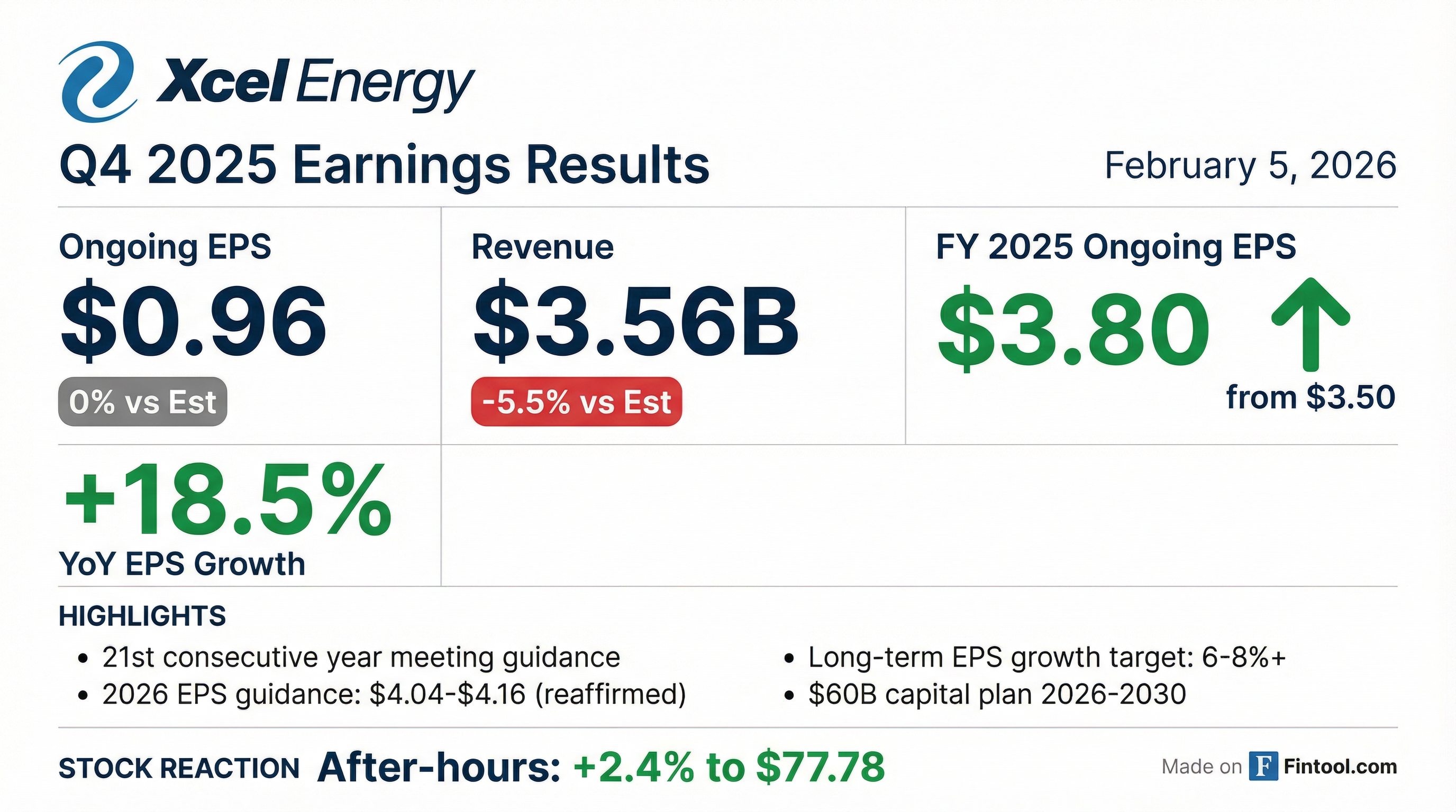 - Xcel Energy delivered $3.80 ongoing EPS in FY 2025, marking its 21st consecutive year of meeting or exceeding guidance (vs. $3.50 in 2024).