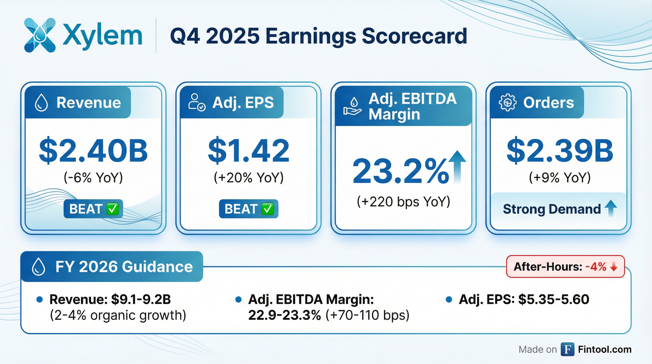 - Xylem delivered record Q4 and full-year revenue, with Q4 revenue up 4% and full-year revenue up 5%, orders +7% in Q4, and a backlog of $4.6 B.