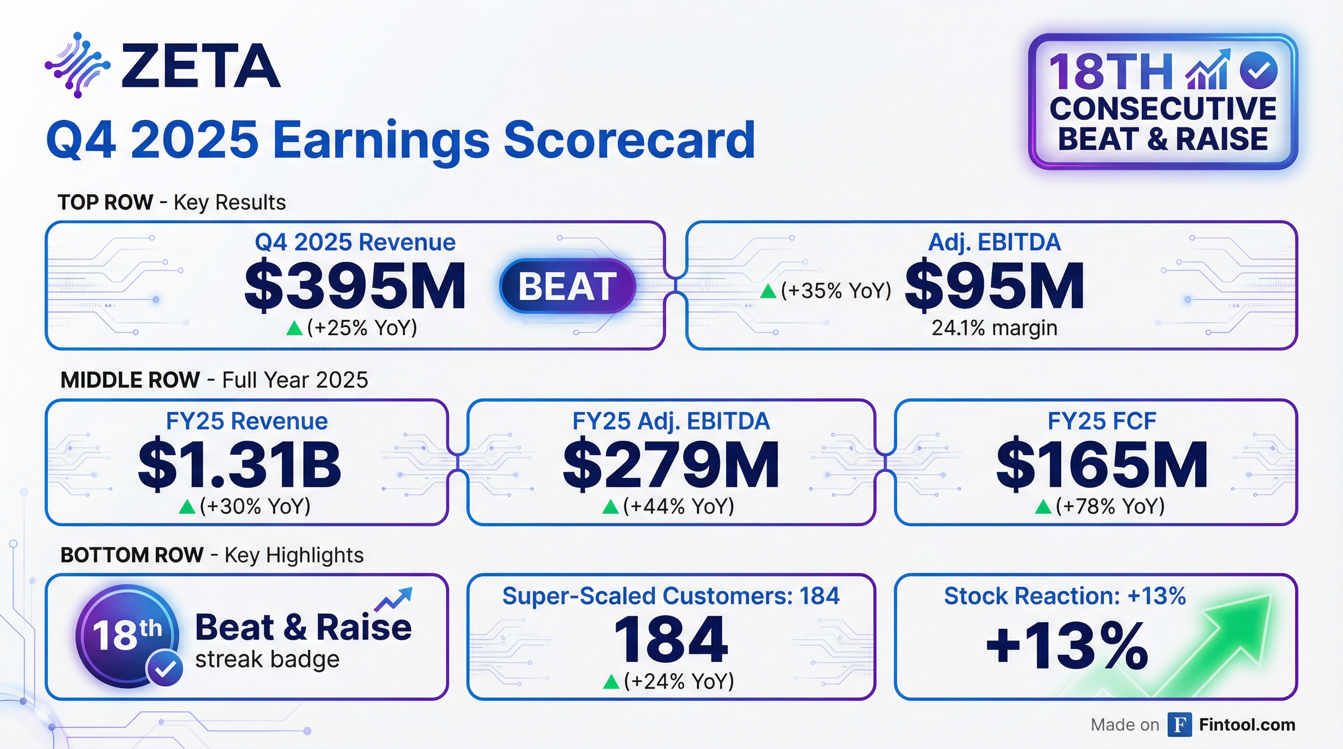 - Zeta Global Holdings reported its 18th consecutive "beat and raise" quarter in Q4 2025, with FY25 revenue growing 30% to $1,305 million and Adjusted EBITDA increasing 44% to $279 million.