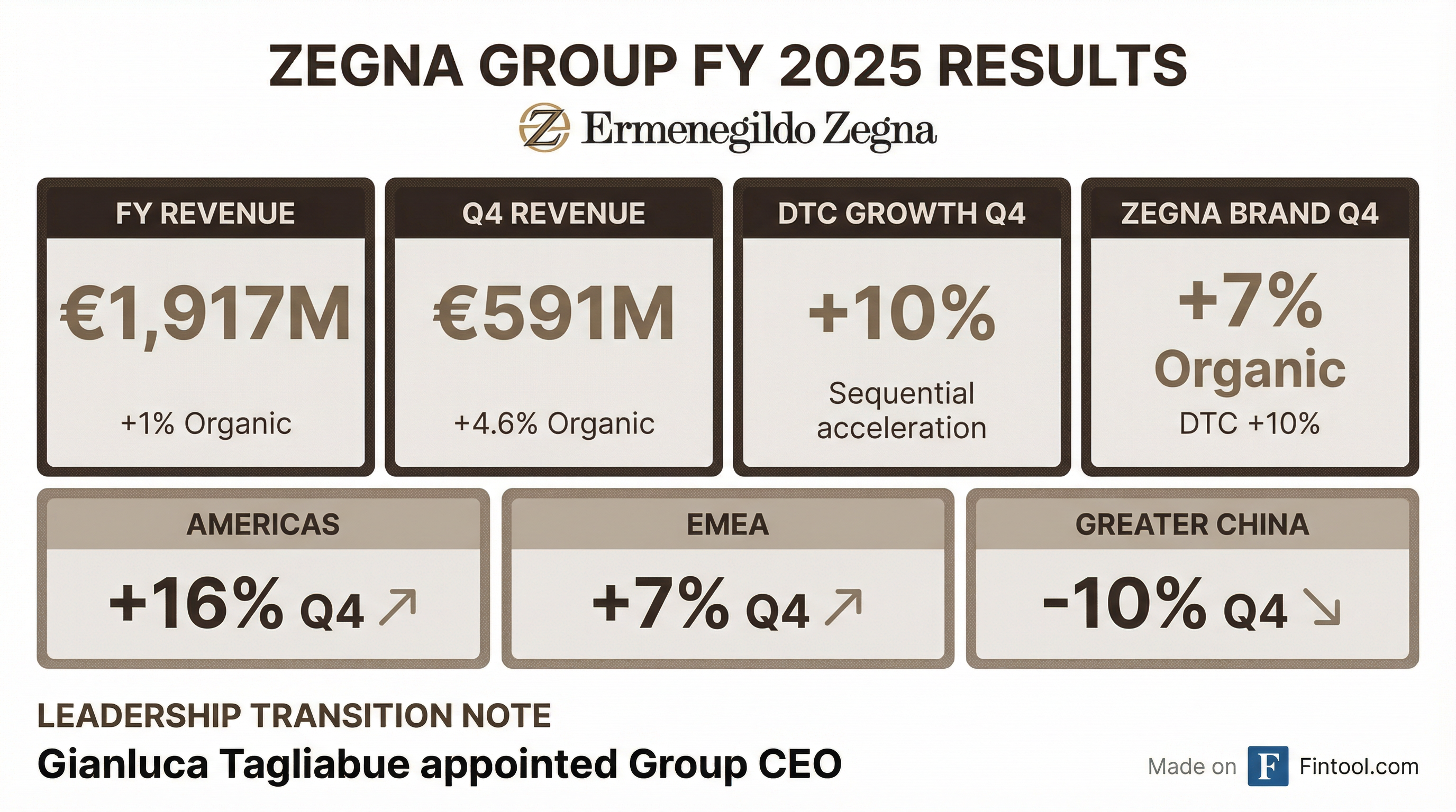 - Zegna Group reported full year 2025 revenues of EUR 1.917 billion and Q4 2025 revenues of EUR 591 million, up 4.6% organically. The Zegna brand achieved EUR 1.2 billion in full year 2025 revenue and EUR 362 million in Q4, growing 7%.