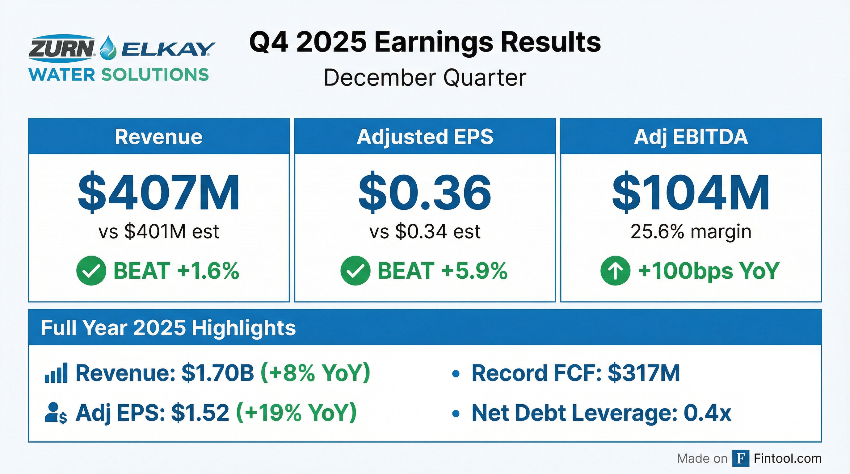 - Zurn Elkay reported Q4 2025 net sales of $407 million, a 10% increase year-over-year, with adjusted EBITDA margin at 25.6%, up 100 basis points year-over-year.