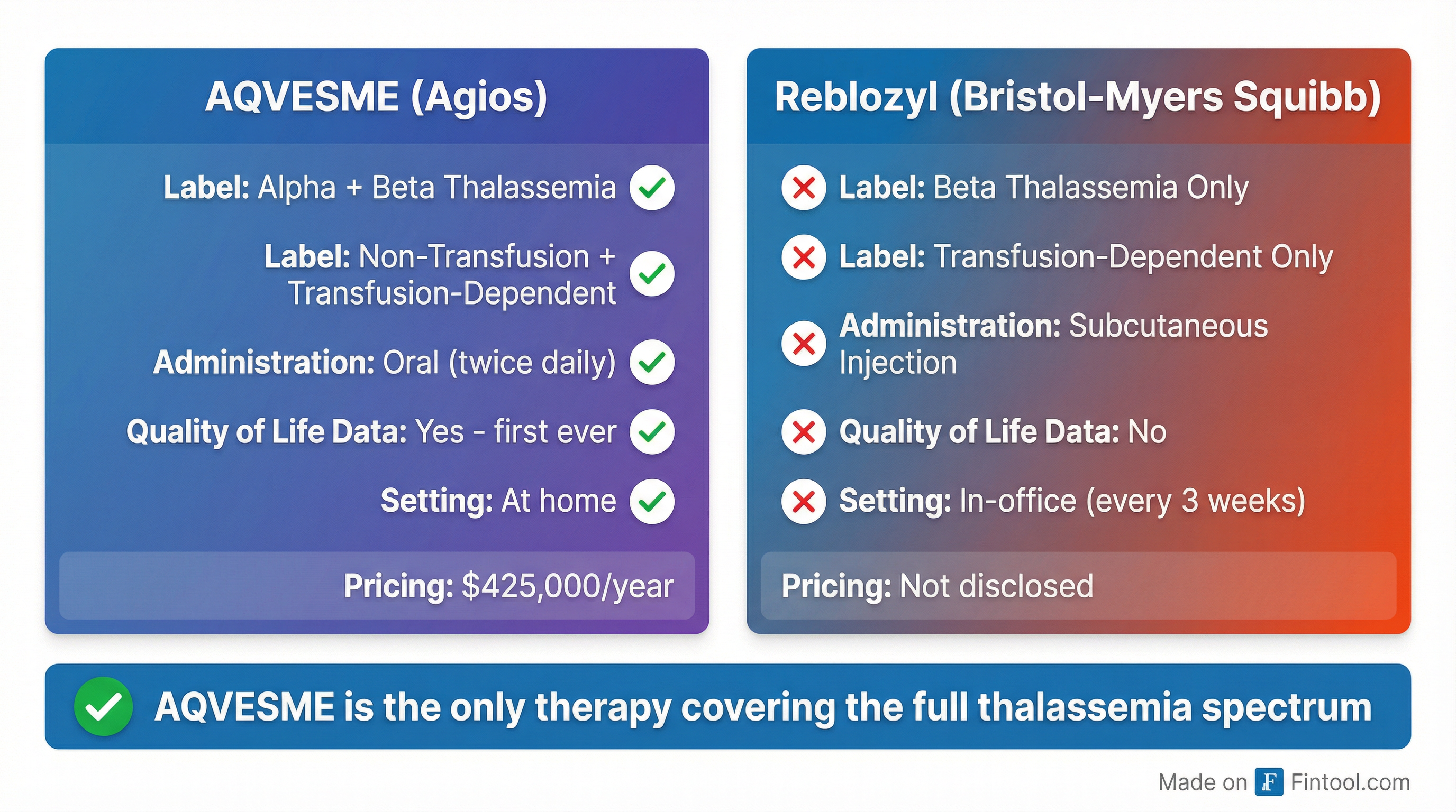 AQVESME's value proposition becomes clear when compared to Bristol-myers Squibb's-0.50% Luspatercept (Reblozyl), the only other approved therapy in the thalassemia space: