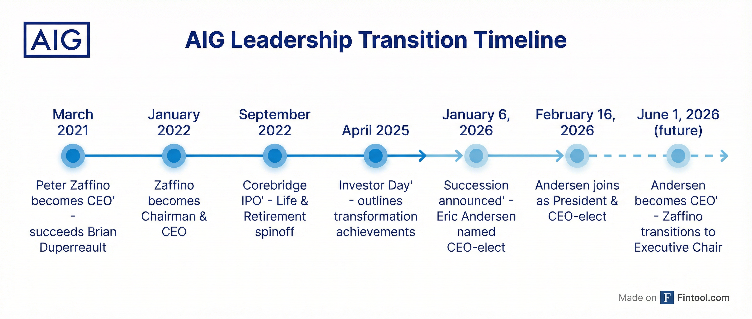 Valuation premium at risk: AIG had traded at an improved multiple under Zaffino. The stock's decline from its April 2025 high of $87.72 to $79.02 on announcement day suggests some of that premium could compress during the transition.