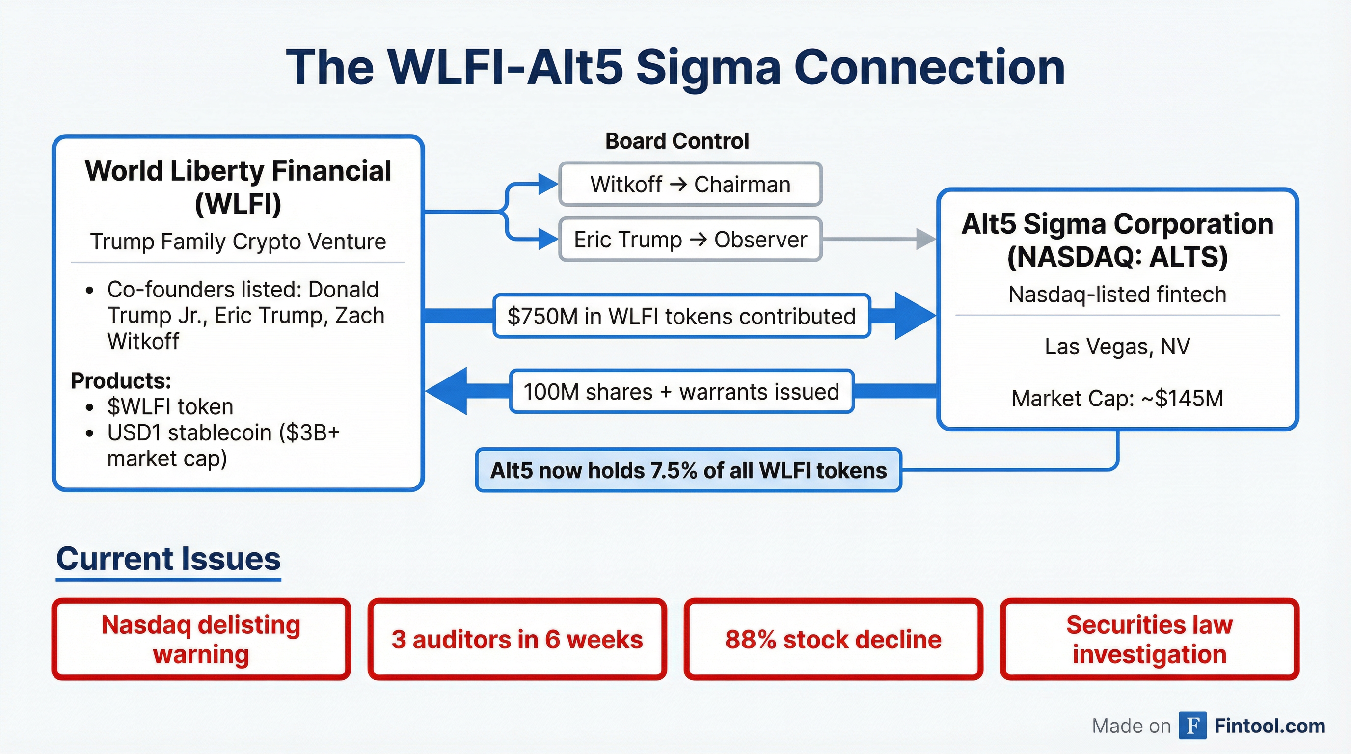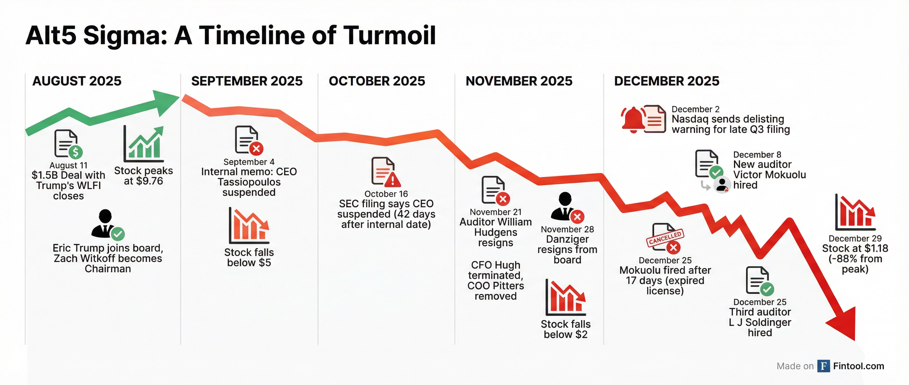 A Nasdaq-listed fintech company tied to the Trump family's World Liberty Financial venture has cycled through three independent auditors in just six weeks, with its latest appointment lasting only 17 days before being dismissed on Christmas Day. Alt5 Sigma Corporation (NASDAQ: ALTS) now trades at $1.18—down 88% from its August peak—as it faces Nasdaq delisting warnings, a law firm investigation, and mounting questions about internal controls.