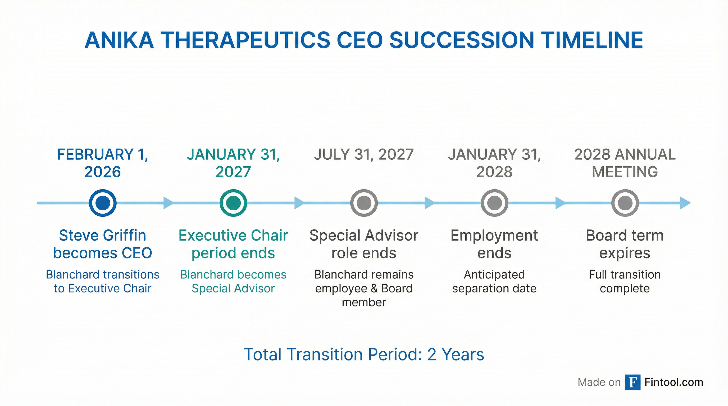 Anika Therapeutics-2.95% announced a CEO transition today, with Cheryl R. Blanchard stepping down as President and CEO effective February 1, 2026, to be succeeded by CFO and COO Steve Griffin. The transition comes after a challenging period that saw the stock decline 66% during Blanchard's tenure, a failed pivotal clinical trial, activist investor pressure, and a major strategic overhaul that jettisoned two business units.