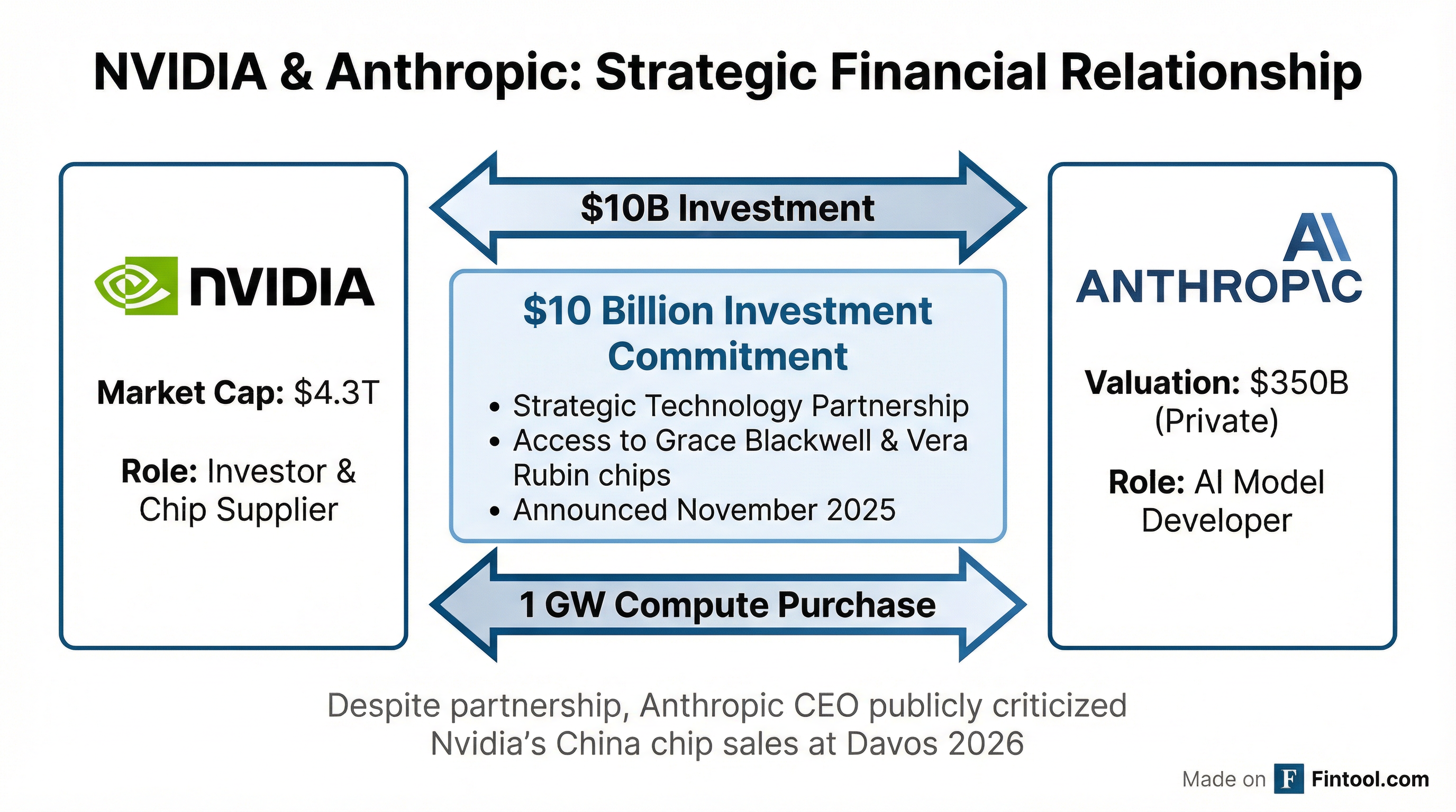 The criticism is remarkable for its source: Nvidia announced just two months ago that it would invest up to $10 billion in Anthropic as part of a sweeping strategic partnership. Amodei is now publicly attacking the core China strategy of a company that has committed billions to his firm.