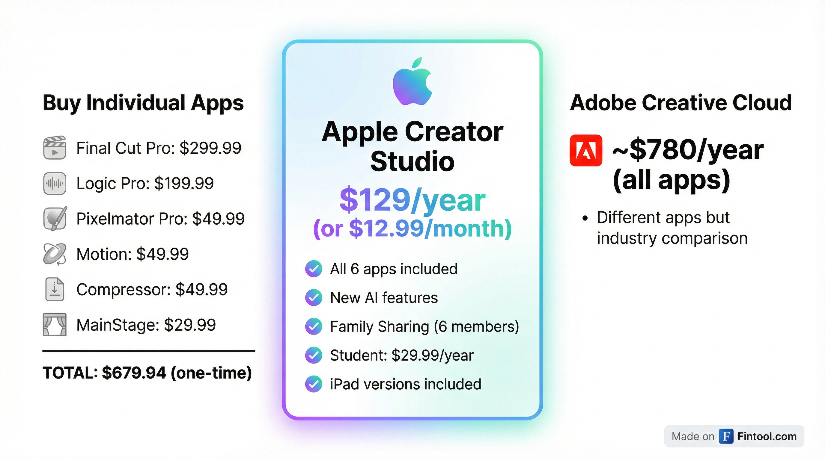For context: purchasing Final Cut Pro ($299.99), Logic Pro ($199.99), and the other included Mac apps separately would cost nearly $680—more than five years of Creator Studio subscription fees.