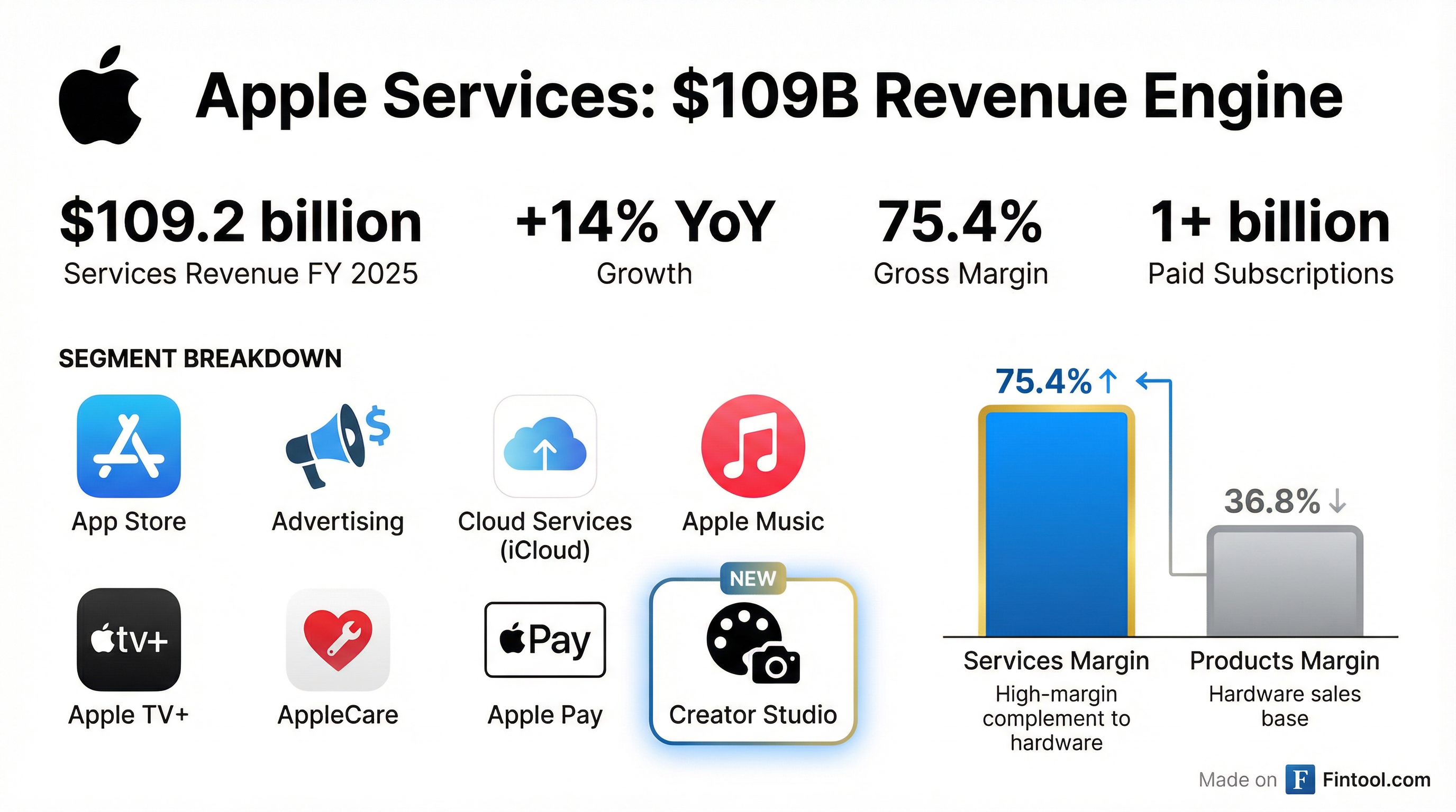 Creator Studio fits squarely into Apple's highest-margin business. In FY 2025, Services generated $109.2 billion in revenue—up 14% year-over-year—with a gross margin of 75.4%, more than double the 36.8% margin on Products.