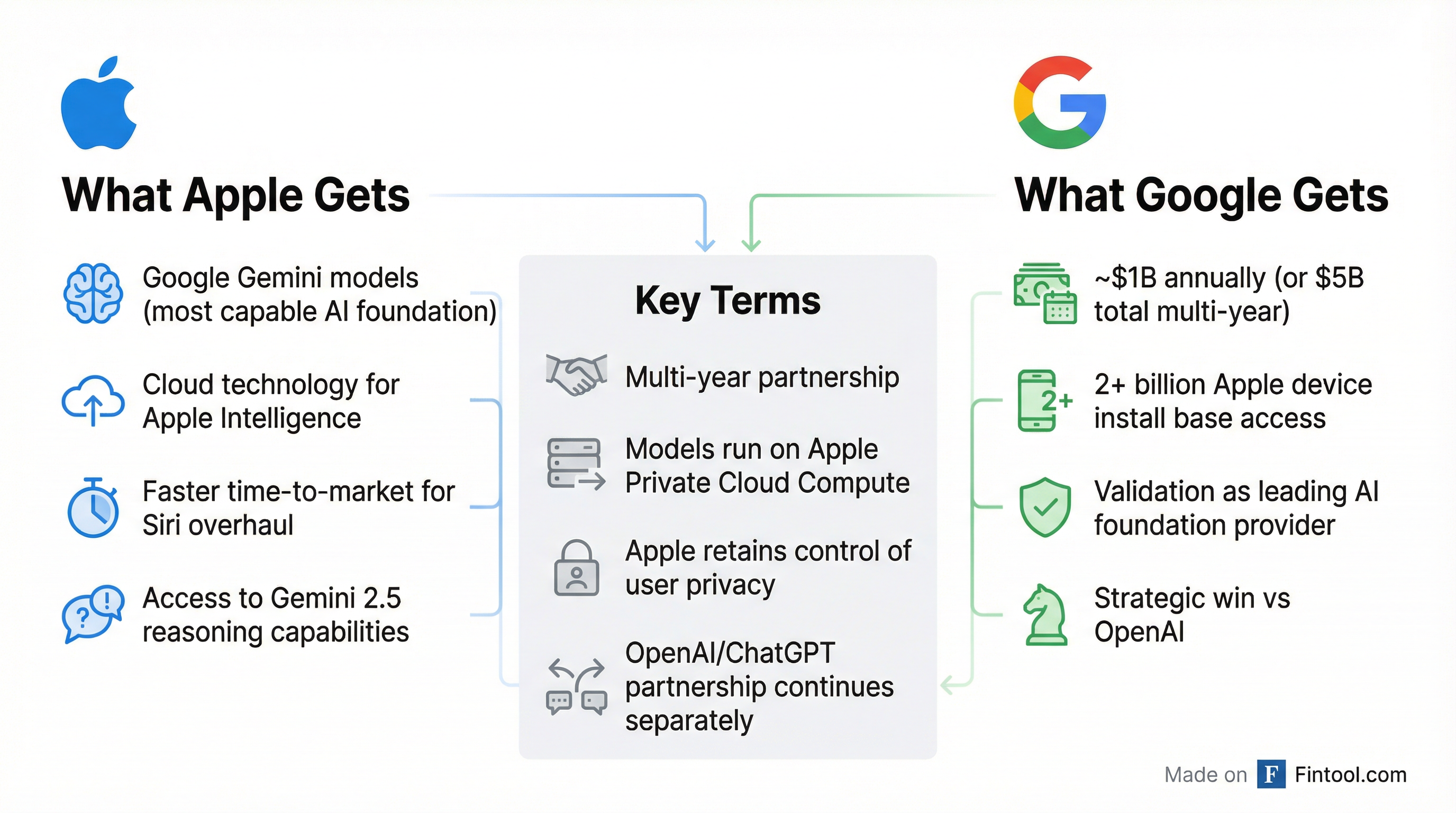 The partnership positions Google's Gemini as the intelligence layer beneath Apple's entire AI ecosystem. Under the multi-year agreement: