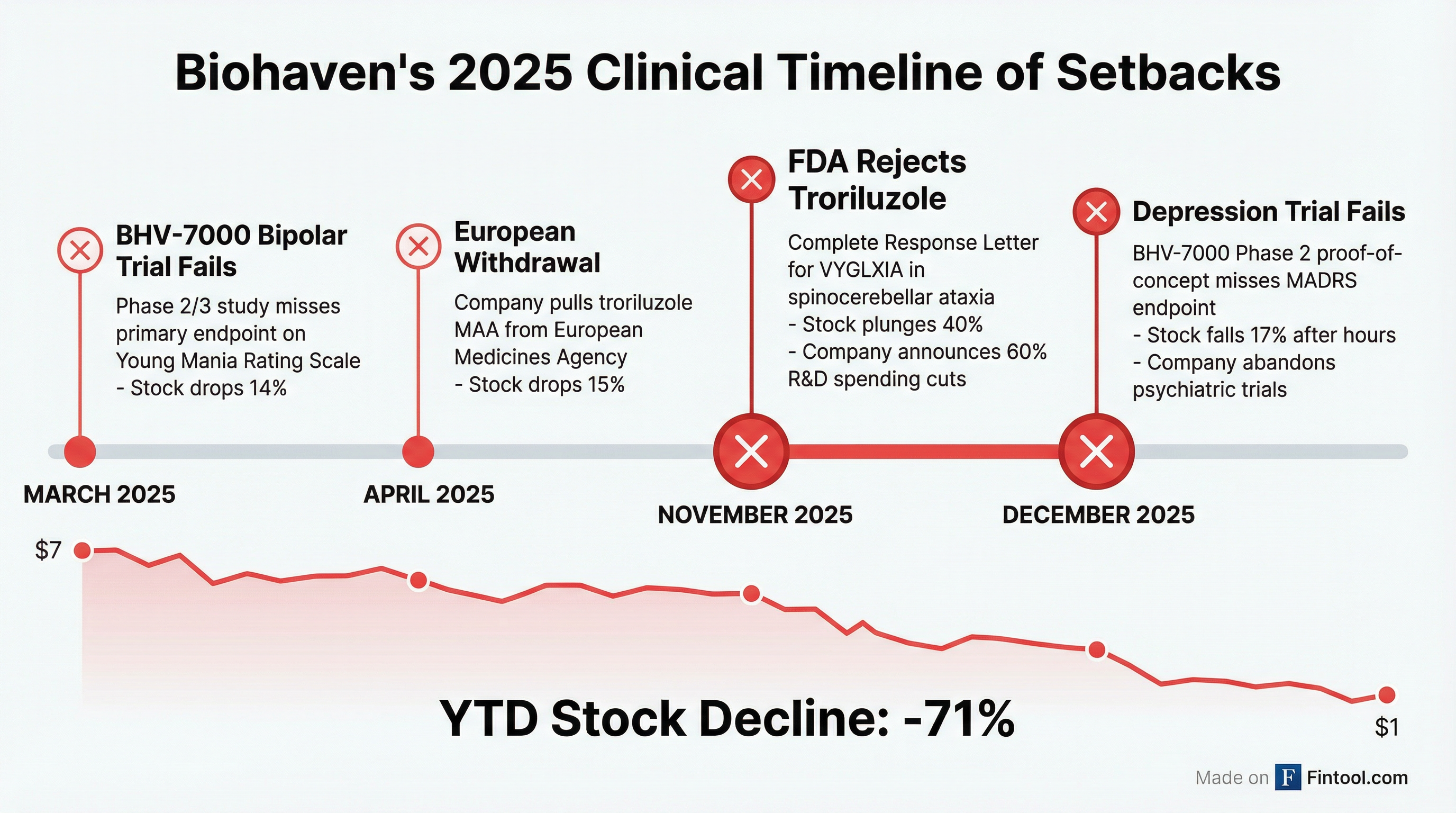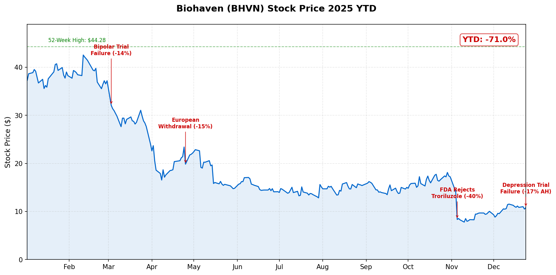 April 2025: Biohaven withdrew its Marketing Authorization Application for troriluzole in Europe, signaling growing regulatory challenges for its lead asset. Shares dropped 15%.