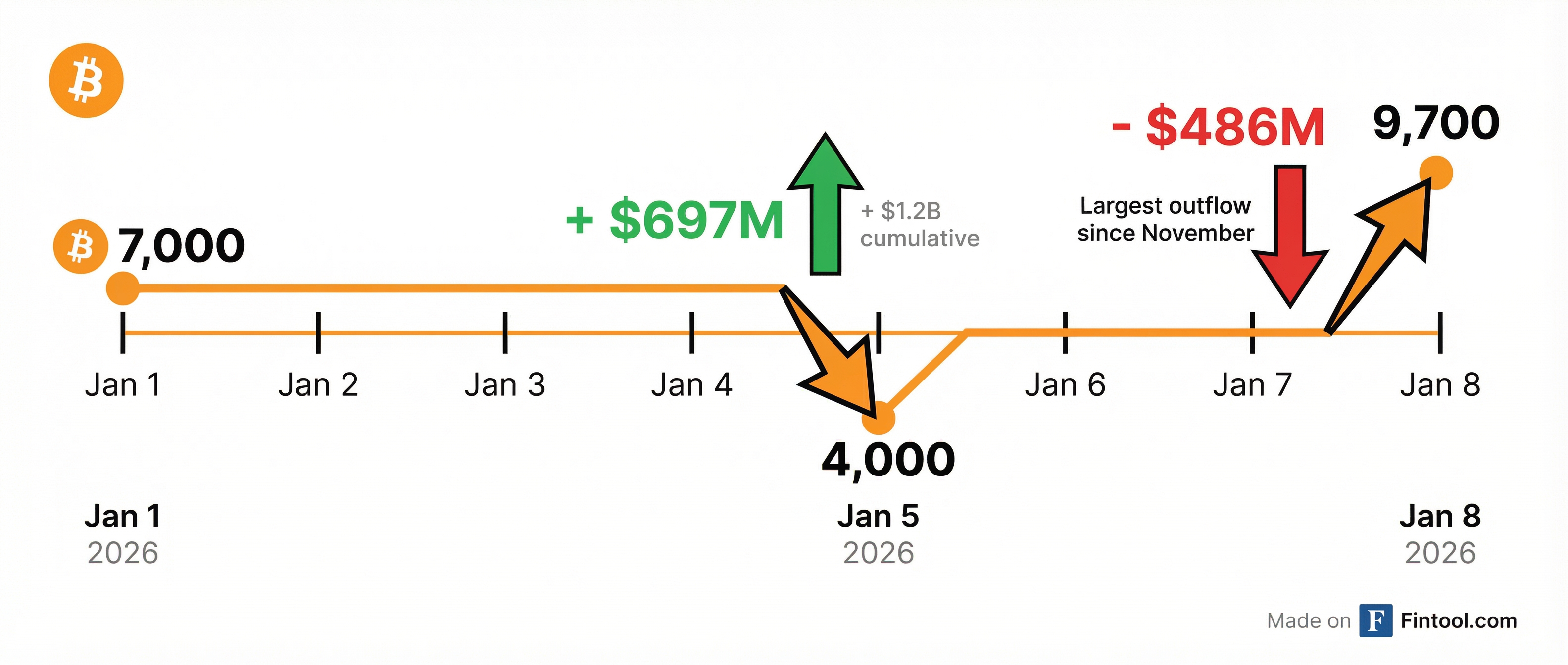 The reversal is stark: Just days ago, U.S. spot bitcoin ETFs recorded their strongest inflows in three months, pulling in $697 million on January 5 alone. Now, two consecutive days of outflows totaling over $700 million have shifted sentiment and dragged prices back to where they started the year.