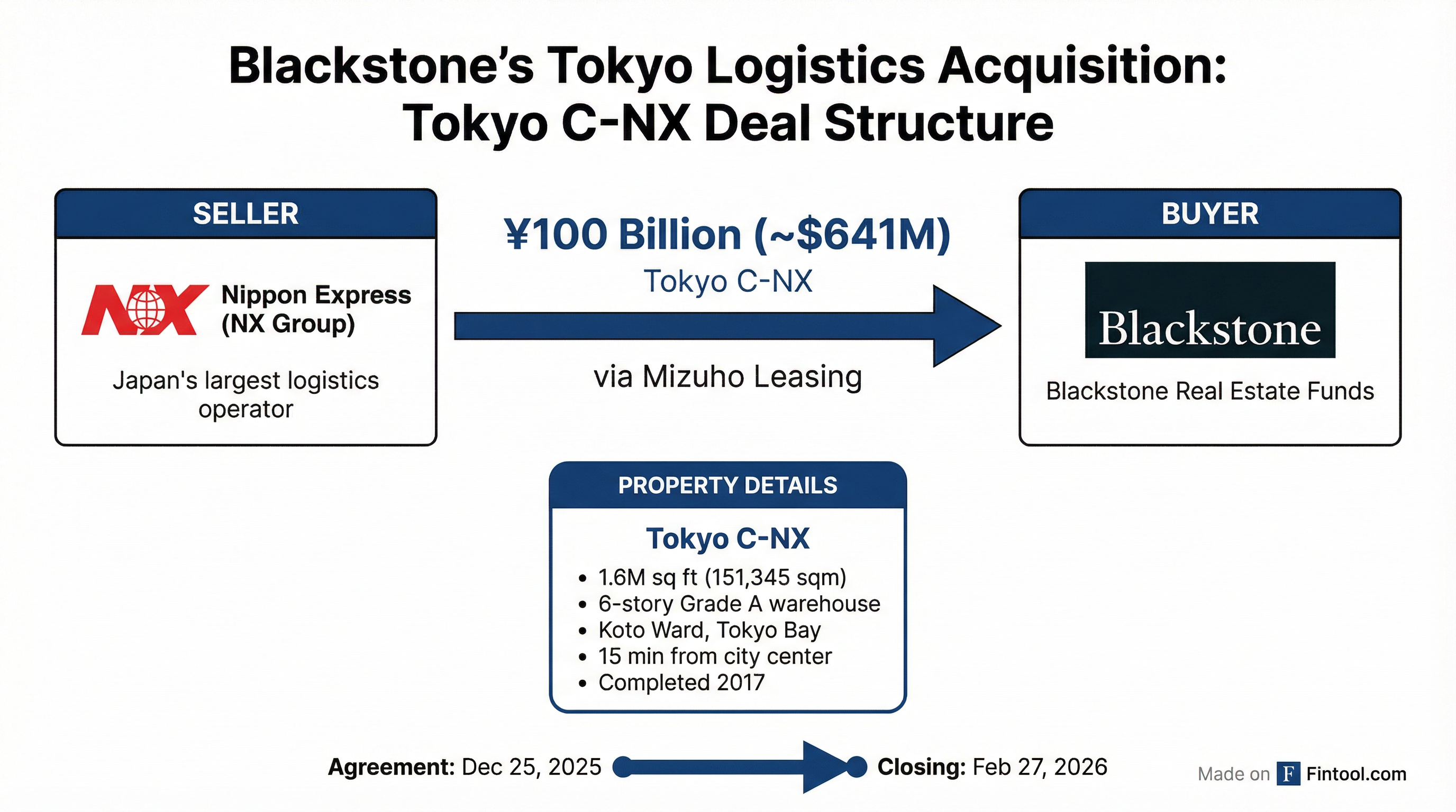 Blackstone is acquiring Tokyo C-NX from Nippon Express, one of Japan's largest logistics operators, for approximately ¥100 billion ($641 million). The transaction, first reported by Nikkei, is being structured through Mizuho Leasing as an intermediary, with the purchase agreement executed on December 25 and closing expected on February 27, 2026.
