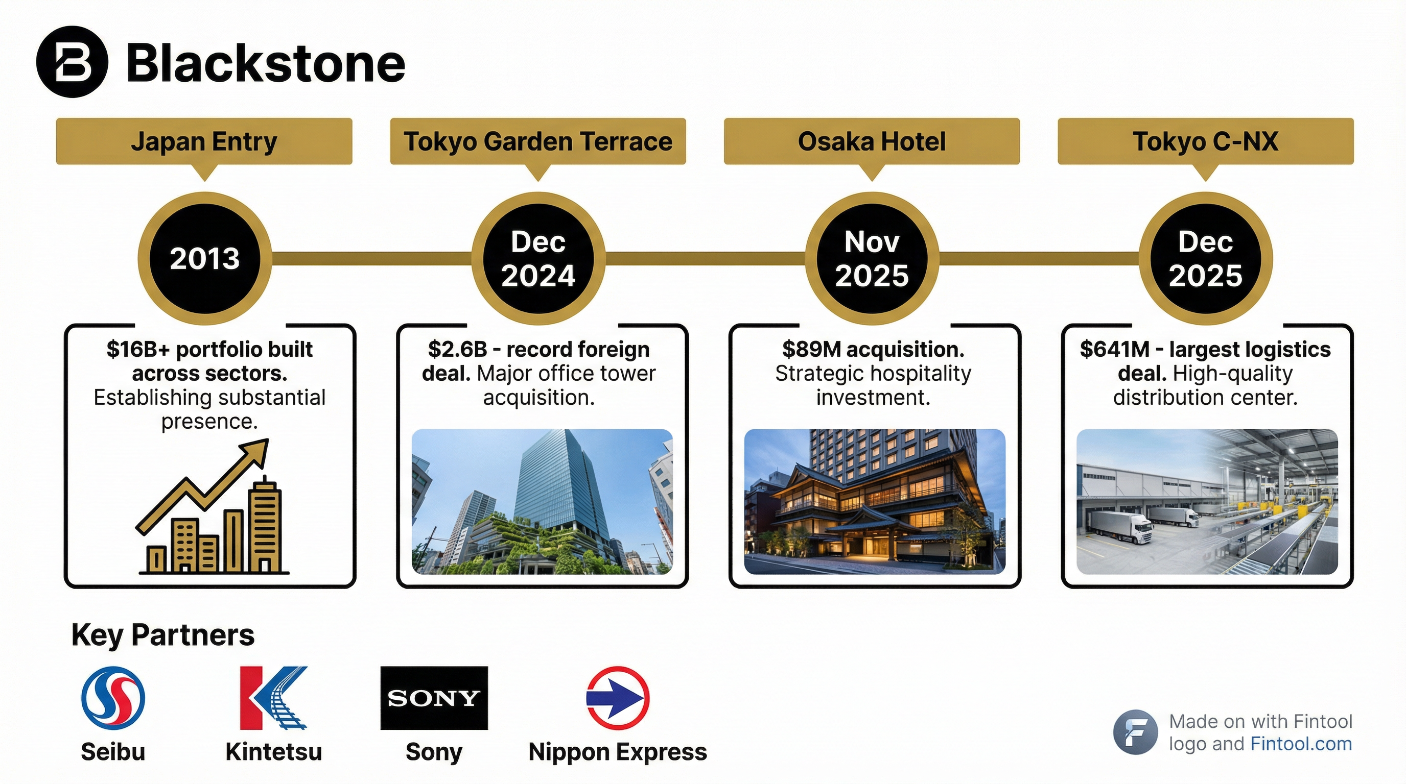 Blackstone-0.41% is closing out 2025 with a $641 million logistics acquisition in Tokyo—Japan's largest warehouse transaction of the year—as the world's largest alternative asset manager continues its aggressive push into Asia's second-largest economy.