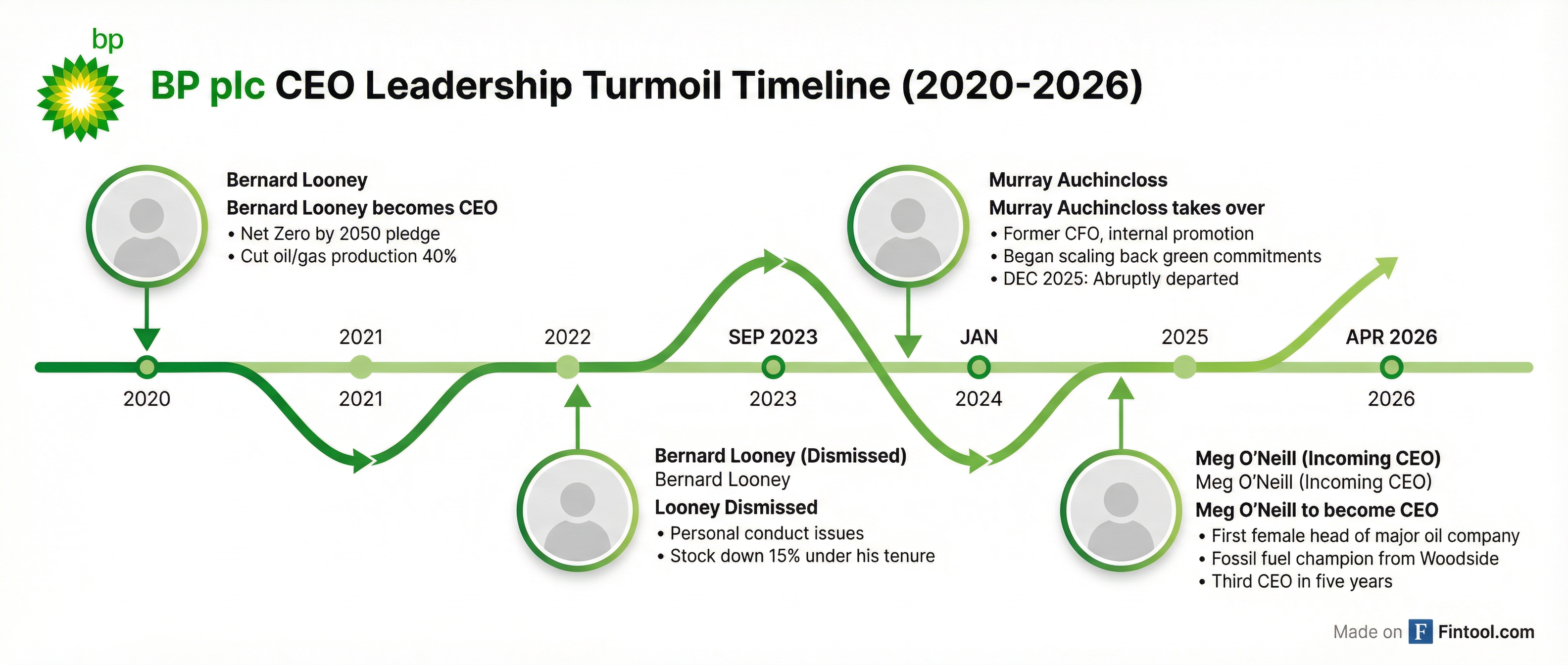 Meg O'Neill (April 2026-): The incoming CEO from Australia's Woodside Energy is considered a fossil fuel champion. She will be the first woman to lead a major oil company. The choice signals BP's commitment to its back-to-basics strategy.