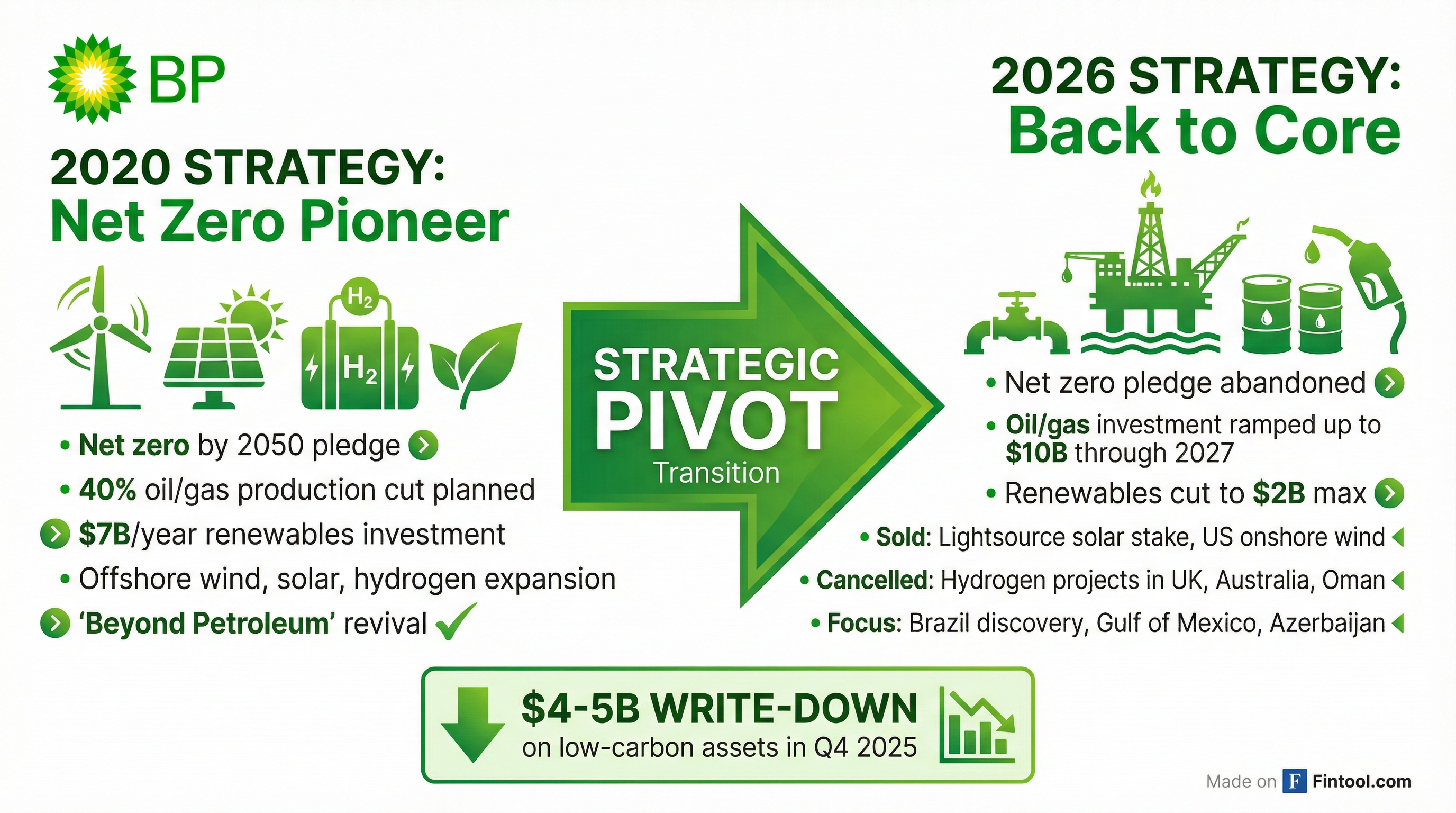 By February 2025, with its stock in the doldrums, BP announced a "fundamental reset" of its strategy—effectively admitting defeat. Renewables spending was slashed. Oil and gas investment was ramped up to $10 billion through 2027. The net-zero timeline was quietly abandoned.