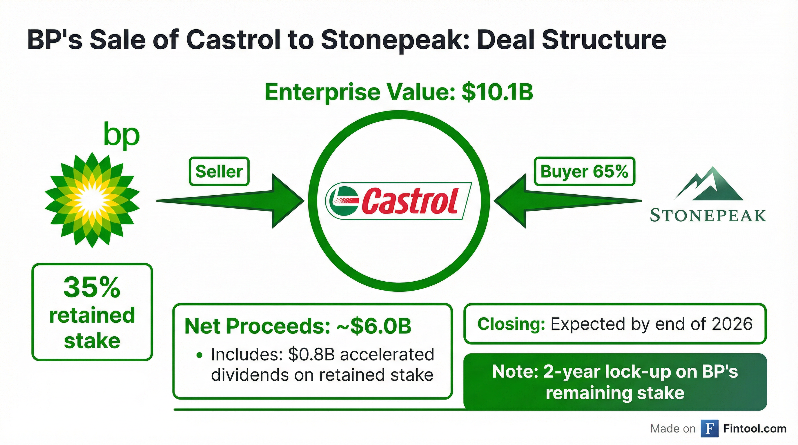 BP-0.07% has struck a deal to sell 65% of its iconic Castrol lubricants business to U.S. private equity firm Stonepeak Partners for approximately $6 billion, marking the largest single transaction in the oil major's $20 billion divestment program and a pivotal moment in its strategic reset.