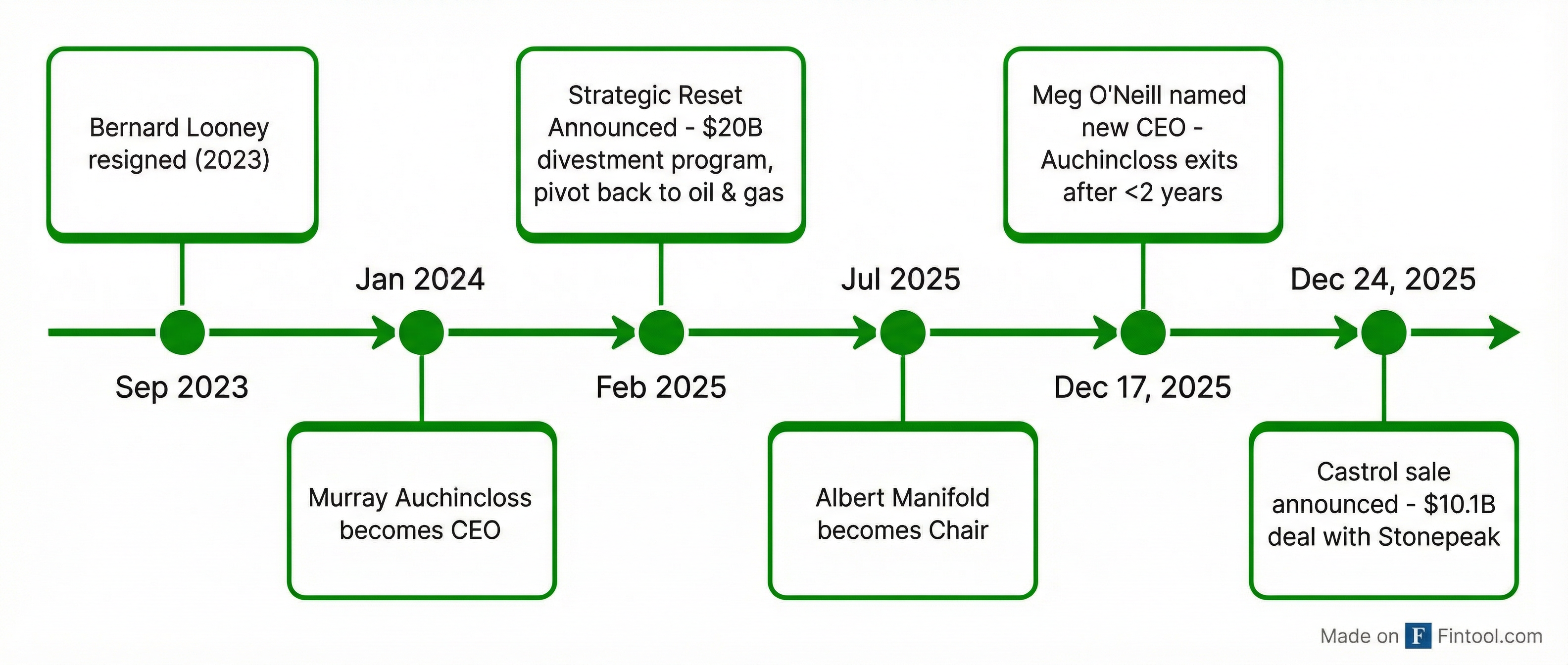 The Castrol sale follows a week of dramatic leadership changes at BP. On December 17, the company announced that Murray Auchincloss would step down after less than two years as CEO—the fourth CEO change in six years.