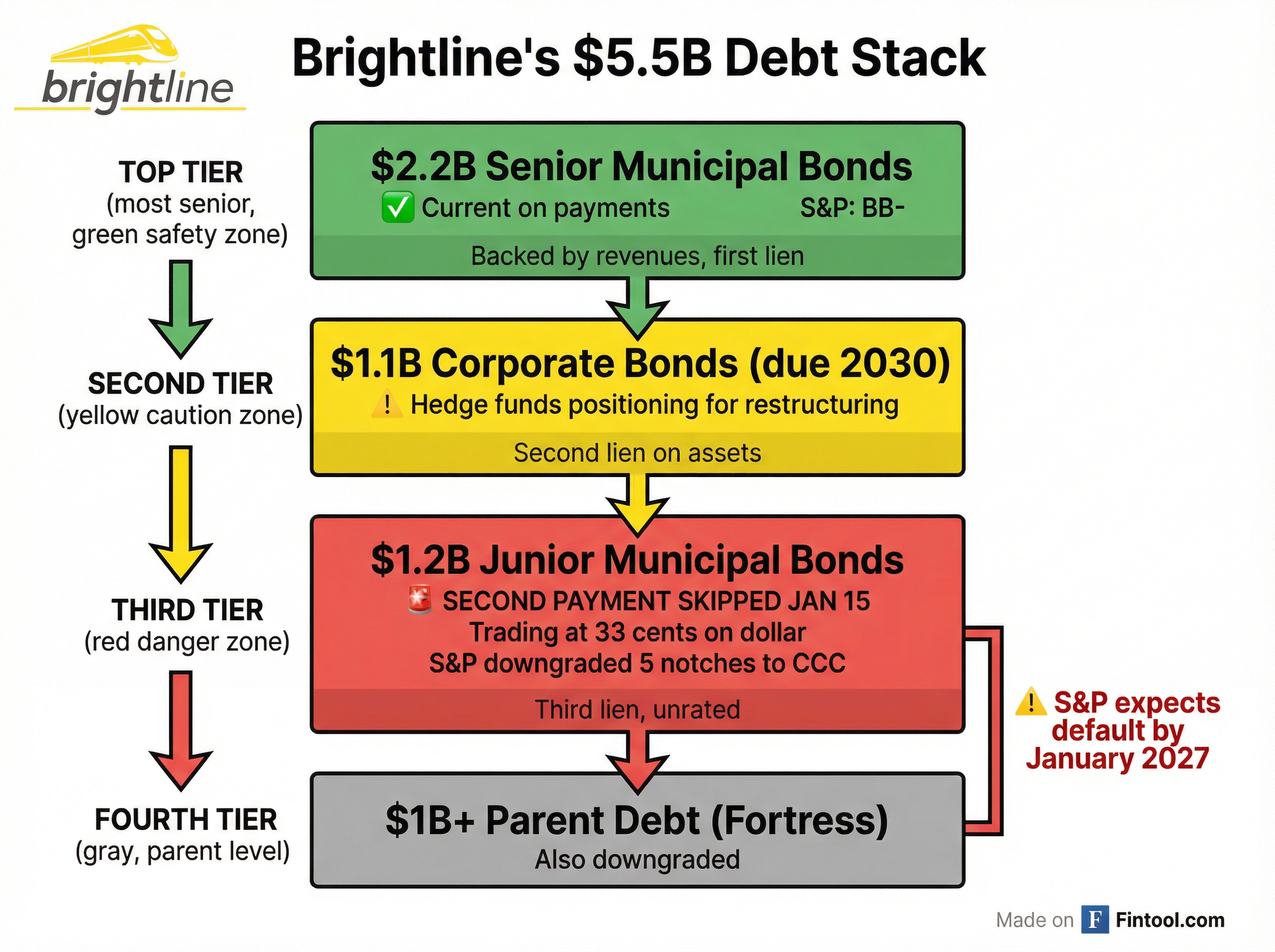 Brightline's complex $5.5 billion capital structure spans multiple tranches with different seniority and payment priority—a setup that has led to diverging fortunes for creditors.