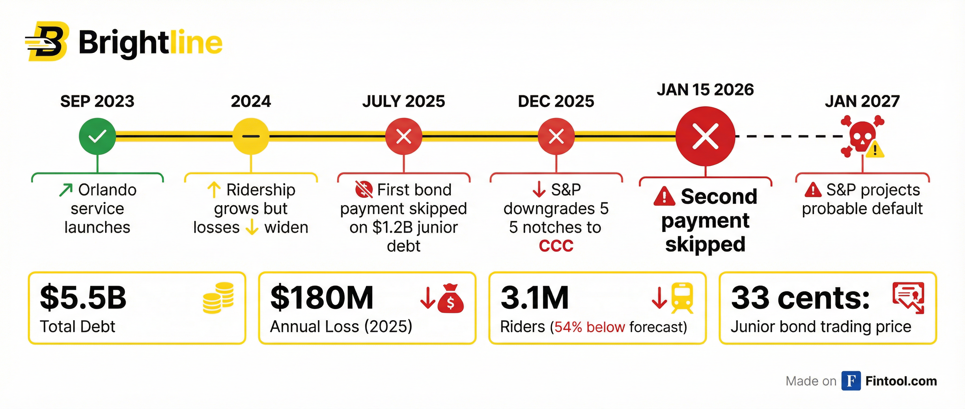 S&P Global Ratings downgraded $2.2 billion of Brightline's municipal bonds five notches last month—from BB- to CCC—and warned of "a higher probability of default by January 2027" as ridership and revenue fell far short of projections.