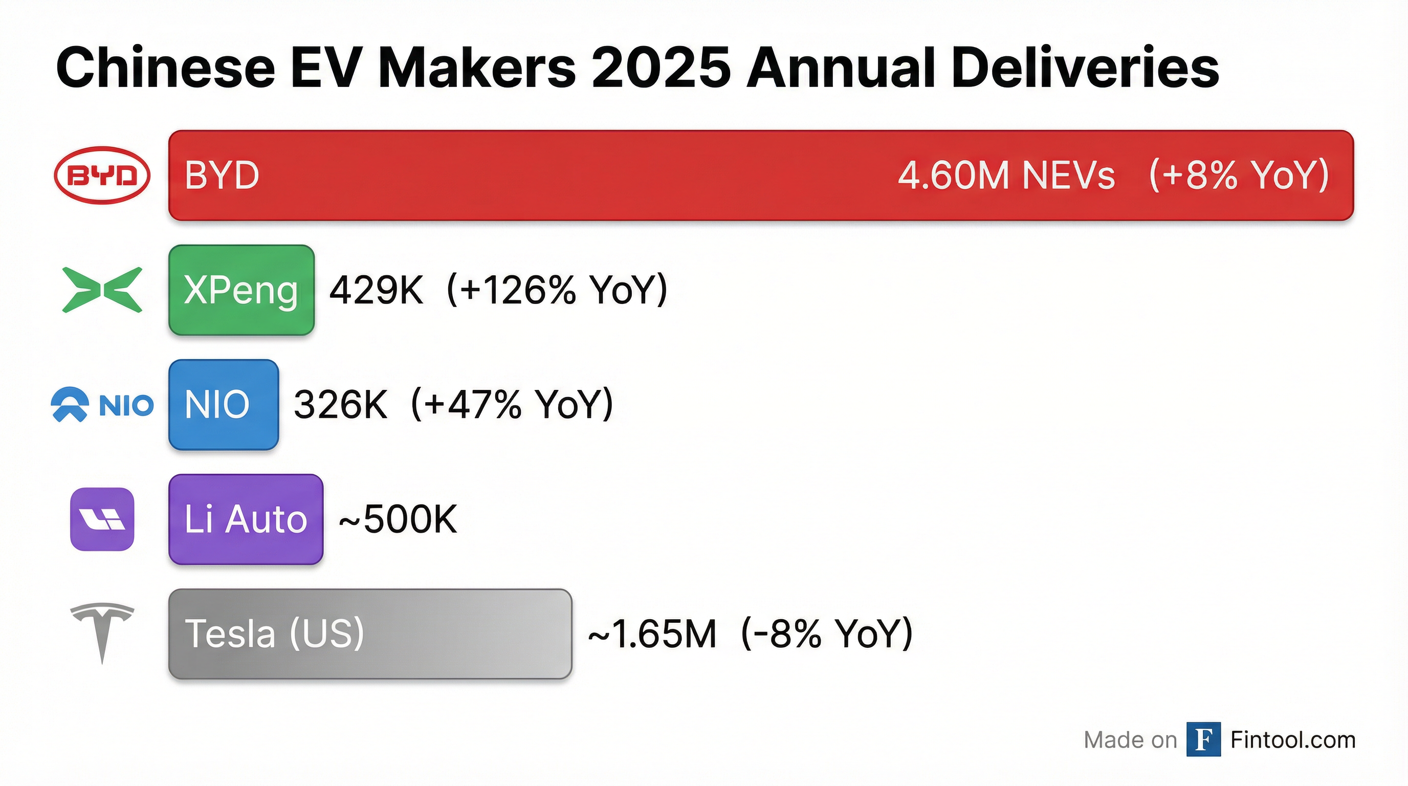 The U.S.-listed Chinese EV startups—NIO, XPeng, and Li Auto—all posted strong growth in 2025, but remain an order of magnitude smaller:
