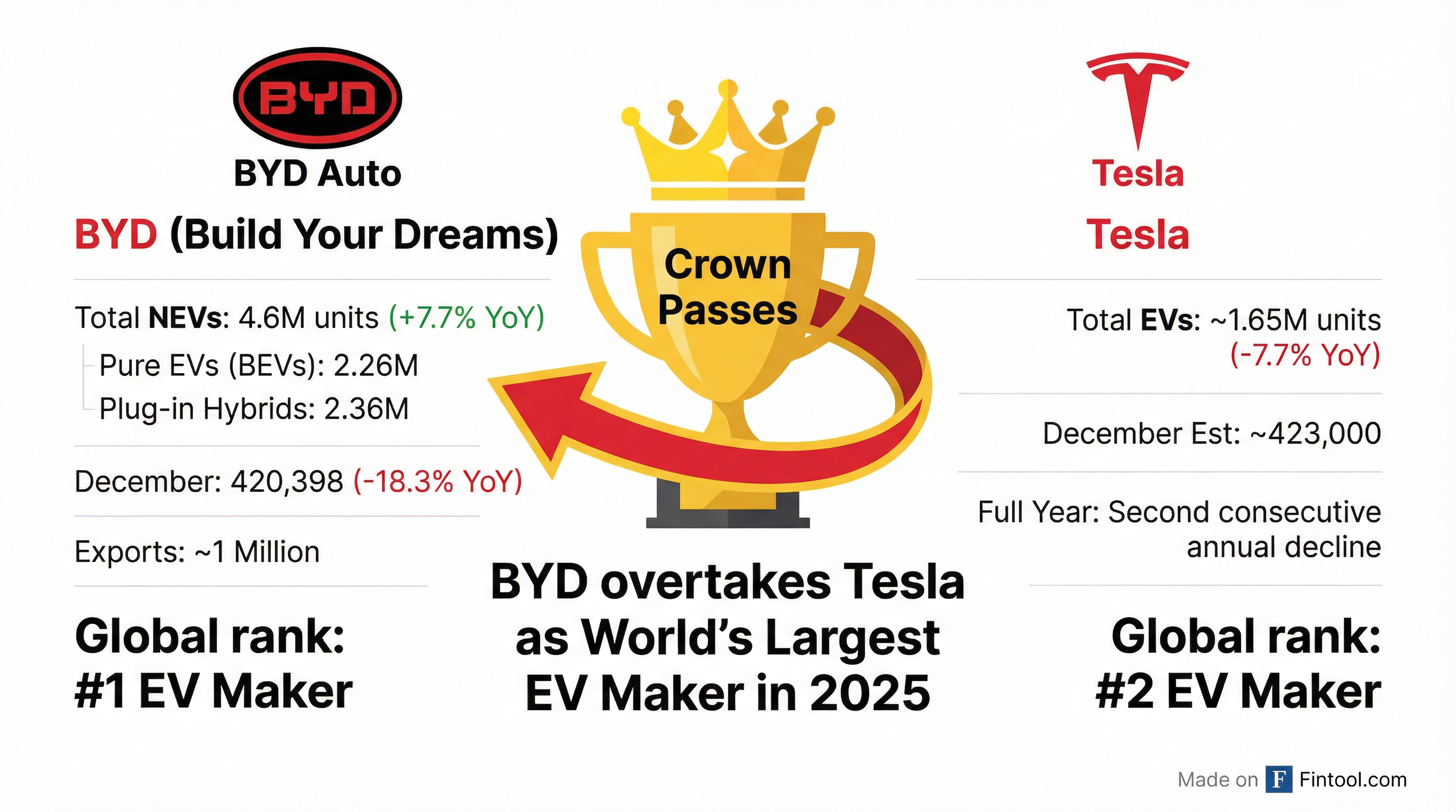 Even counting pure battery-electric vehicles only—excluding BYD's plug-in hybrids—the Chinese giant sold approximately 2.26 million BEVs versus Tesla's projected total, making the leadership transition unambiguous.