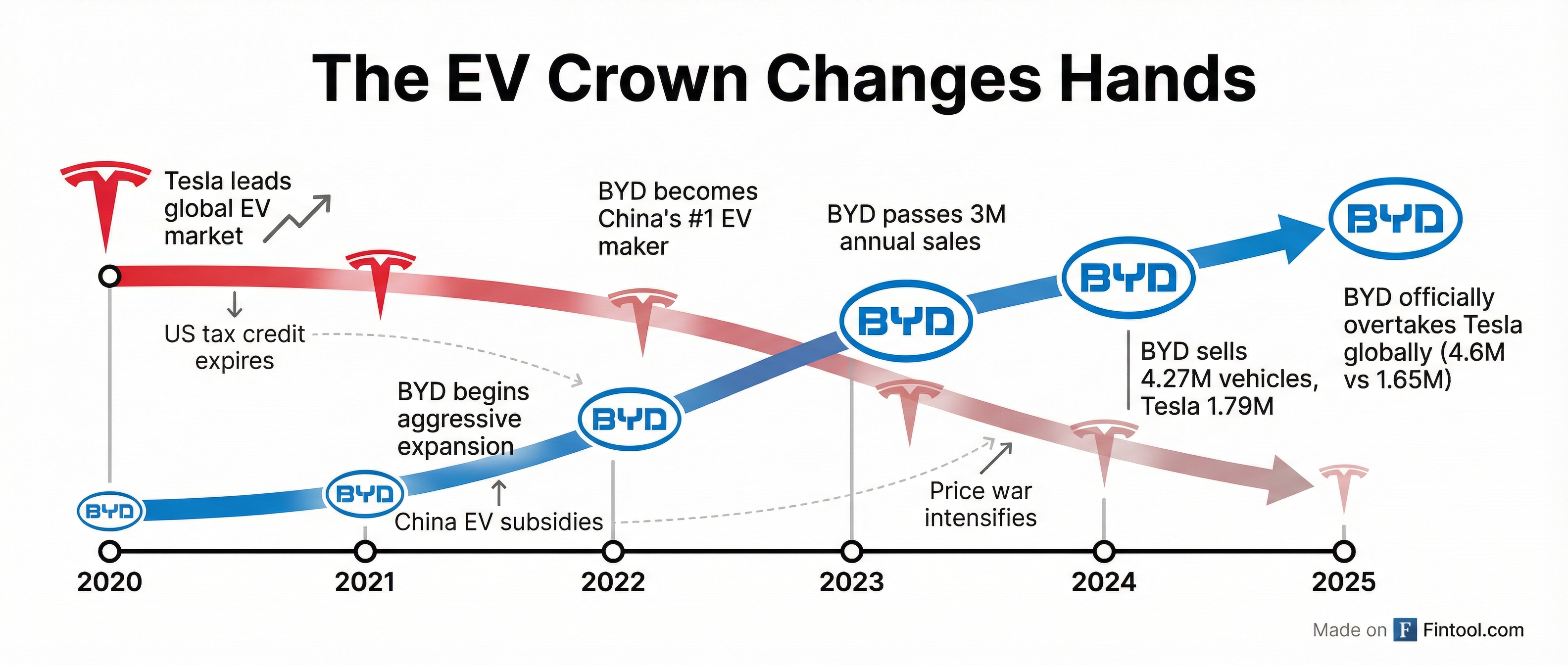 The changing of the guard is official: BYD-0.24% has overtaken Tesla-1.79% as the world's largest electric vehicle maker by annual sales—a seismic shift in an industry Tesla created and dominated for over a decade. The Shenzhen-based automaker sold 4.6 million new energy vehicles in 2025, more than double Tesla's expected 1.65 million deliveries, according to figures released Wednesday.