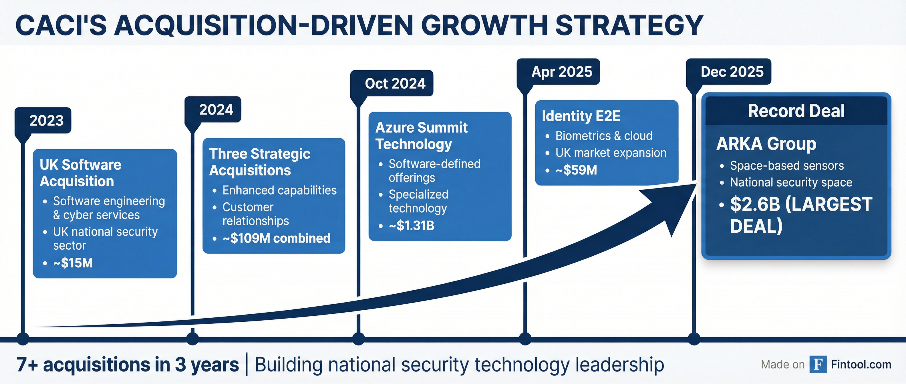 The standout was October 2024's $1.3 billion acquisition of Azure Summit Technology, which expanded CACI's software-defined offerings and specialized technologies. The ARKA deal is nearly double that size and signals management's conviction that space-based capabilities are critical to the company's future.