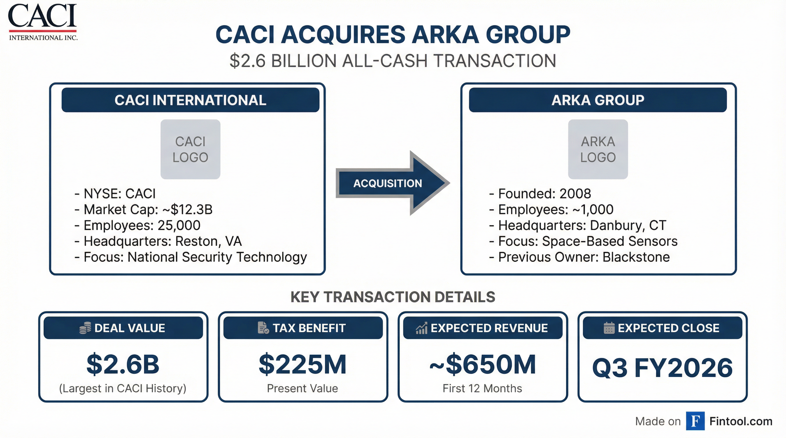 Regulatory approvals: The transaction requires standard regulatory clearances given the classified nature of ARKA's work. CACI expects to close by the end of June 2026.