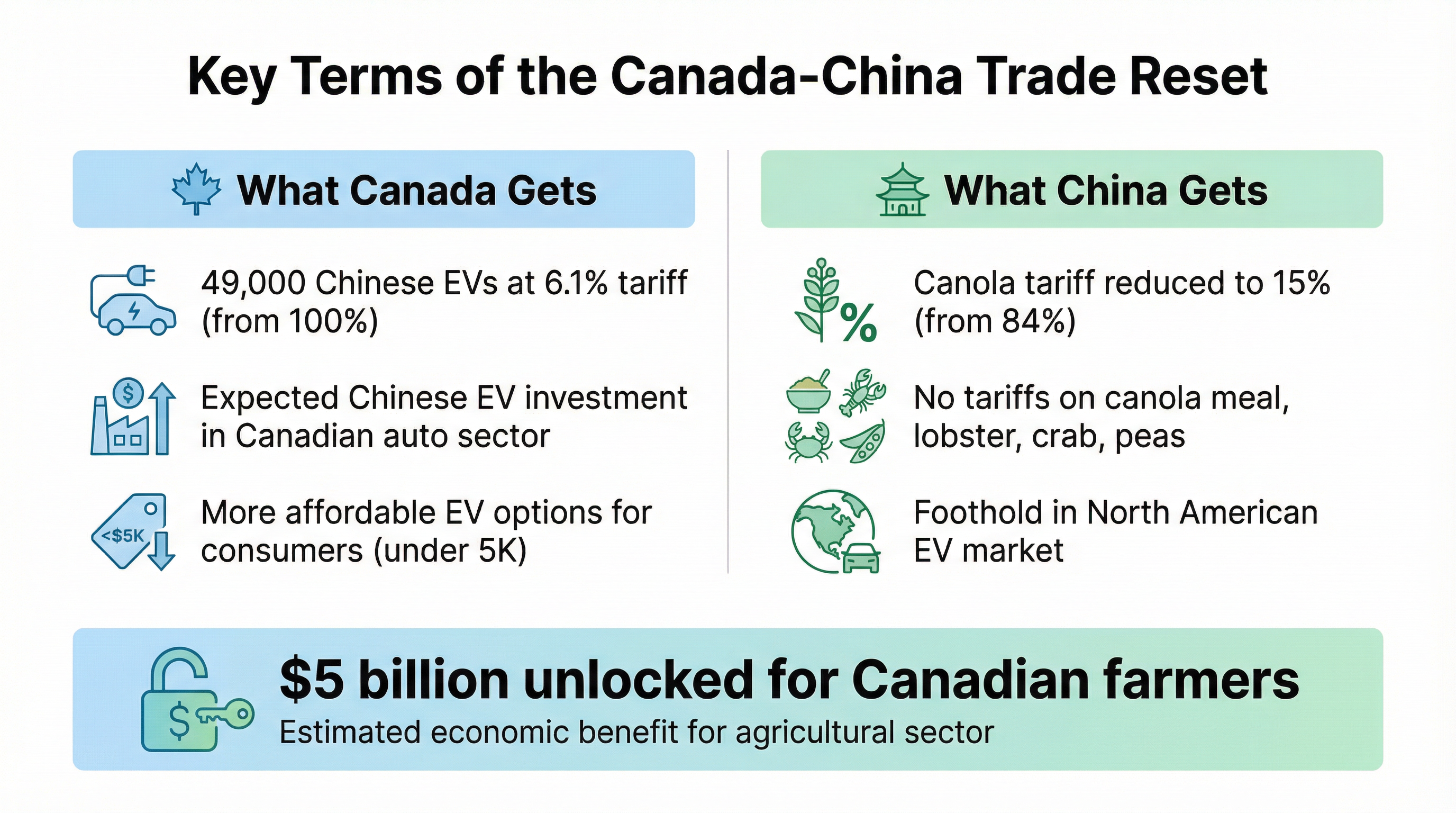 The landmark agreement, forged during the first Canadian prime ministerial visit to China since 2017, allows up to 49,000 Chinese EVs into Canada annually at preferential rates—roughly 3% of the 1.8 million vehicles sold there each year. In exchange, Beijing will slash tariffs on Canadian canola from 84% to about 15%, unlocking what Carney called "nearly $3 billion in export orders" for Canadian farmers.