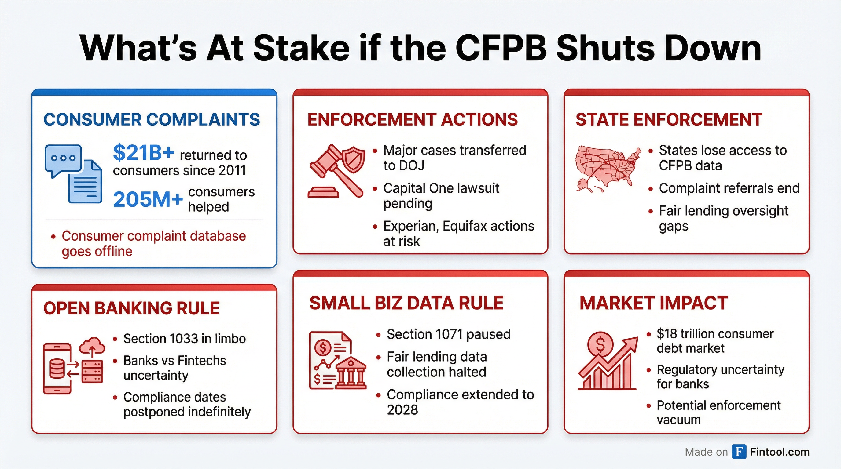 If the court denies the injunction, the CFPB enters shutdown mode. Most enforcement, supervision, and rulemaking activities would pause. The consumer complaint database goes dark. And states would become the de facto front line for consumer financial protection.