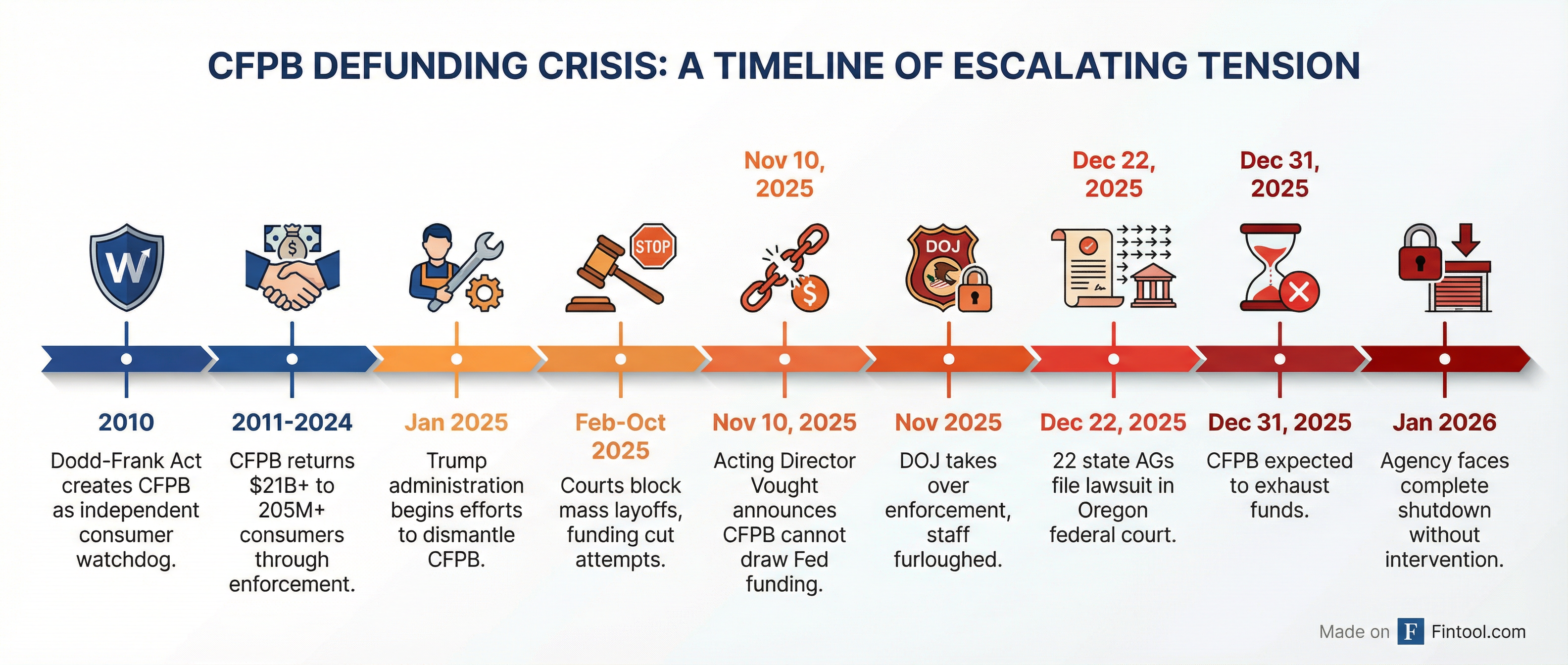 - January 2025: Trump administration begins efforts to gut the CFPB