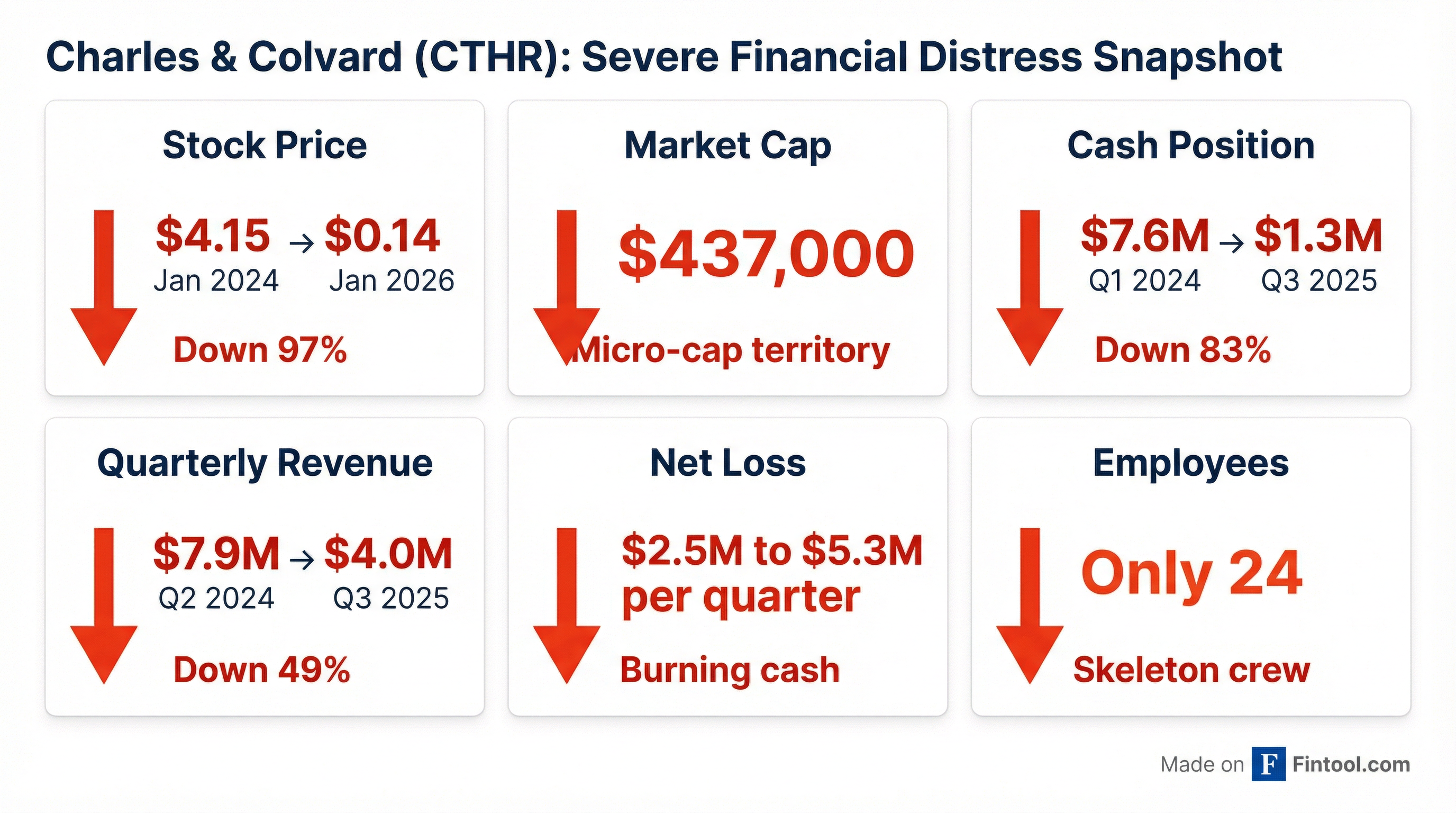 For O'Connell, who joined Charles & Colvard in 2016 as COO before being elevated to CEO in 2020, the termination marks an unceremonious end to a nearly decade-long tenure. His termination "without Cause" suggests he's entitled to severance benefits under his employment agreement — an additional expense for a company that can ill afford it.