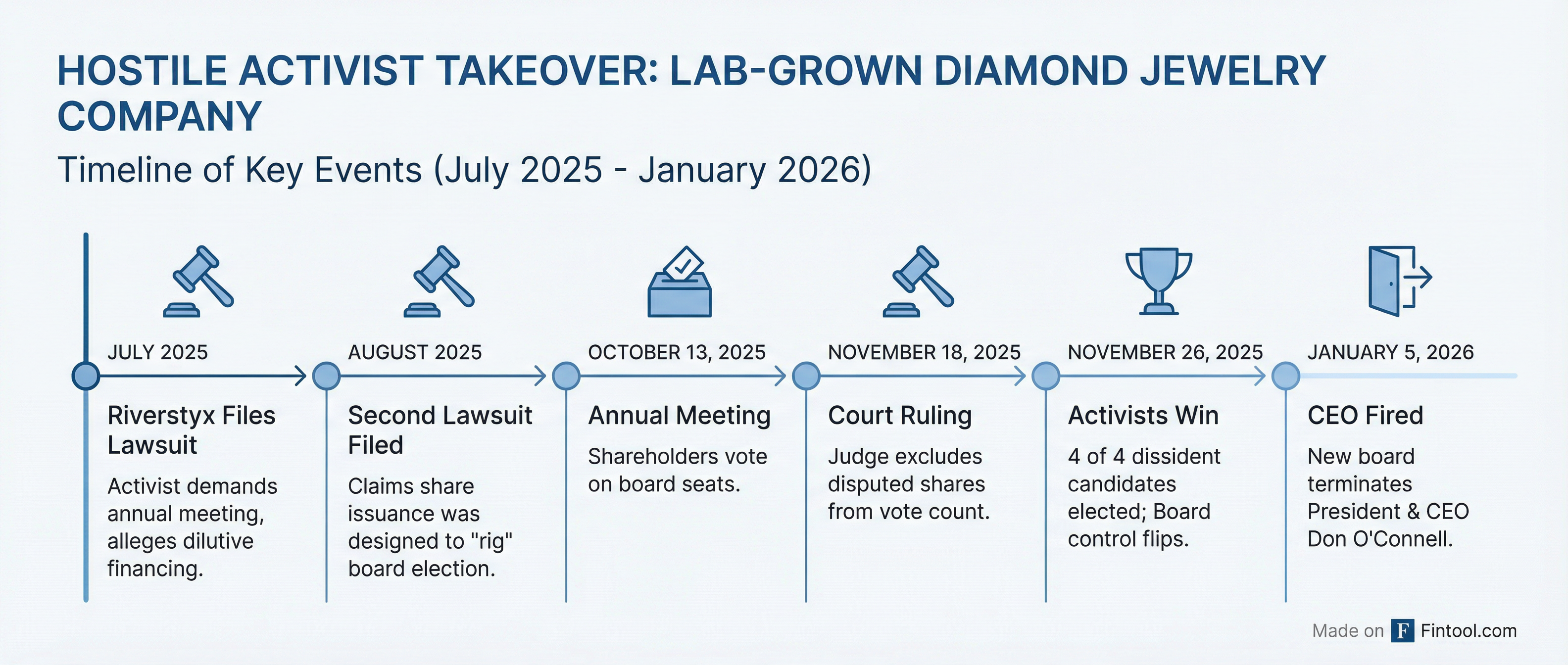 The management shakeup caps a tumultuous six months for the Morrisville, North Carolina-based lab-grown diamond and moissanite jewelry company, which saw its stock collapse 97%, narrowly avoided delisting, and became the target of two shareholder lawsuits that ultimately tipped a contentious proxy fight in the activists' favor.
