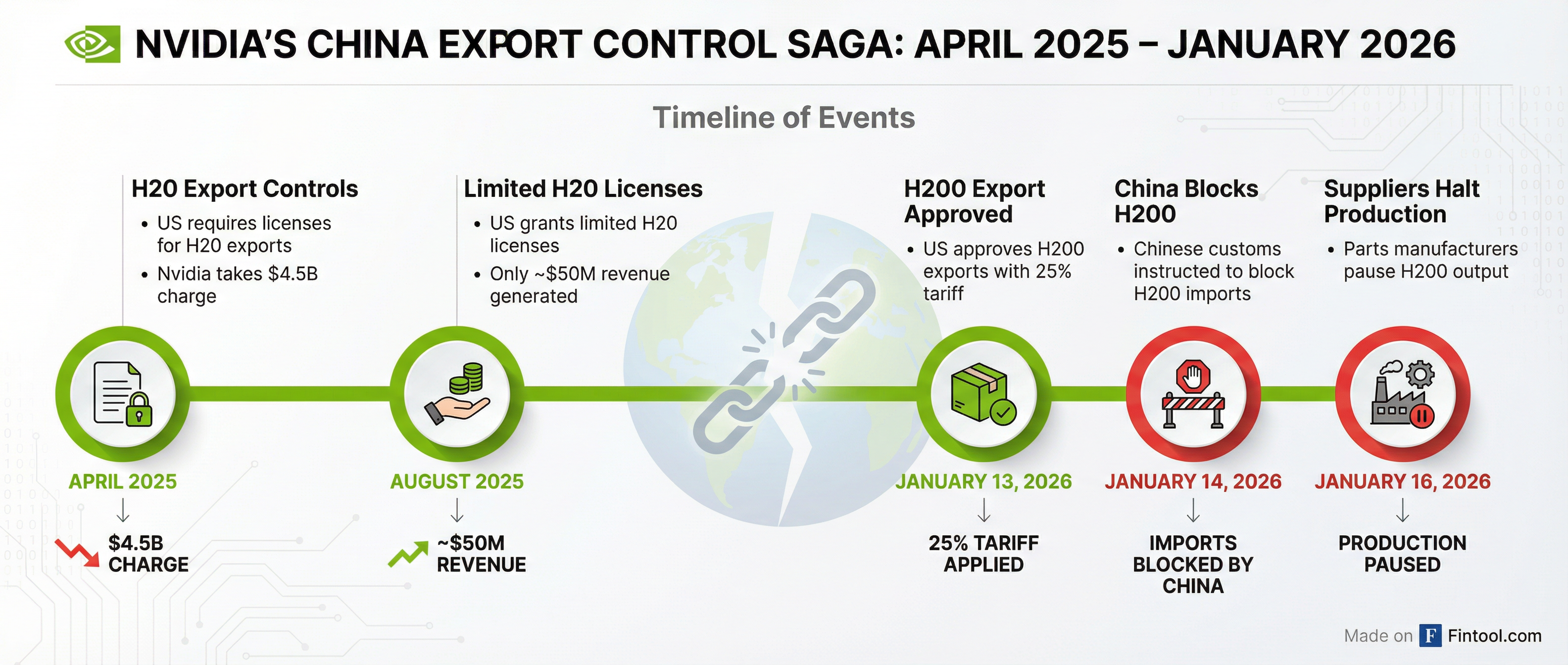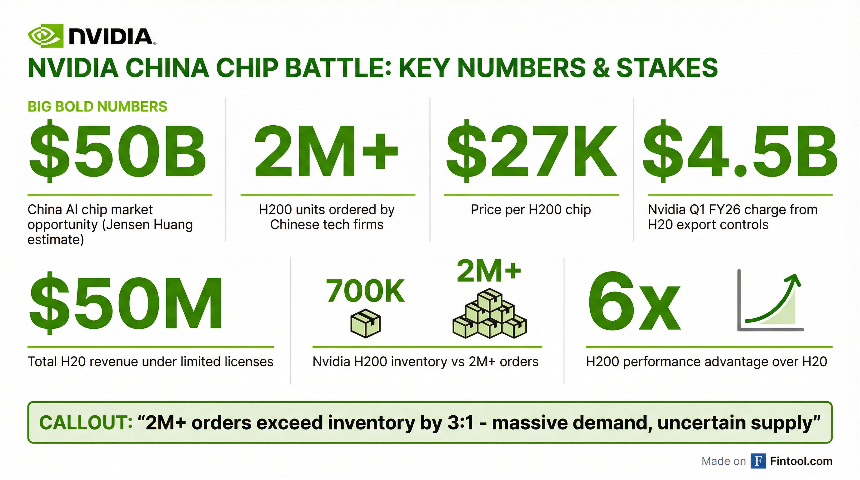 For context, the H200 delivers roughly 6x the performance of the H20, Nvidia's China-compliant chip that was itself blocked in April 2025. That H20 ban resulted in a $4.5 billion inventory charge in Q1 FY26 . As of August 2025, Nvidia had generated only ~$50 million in H20 revenue under limited licenses .