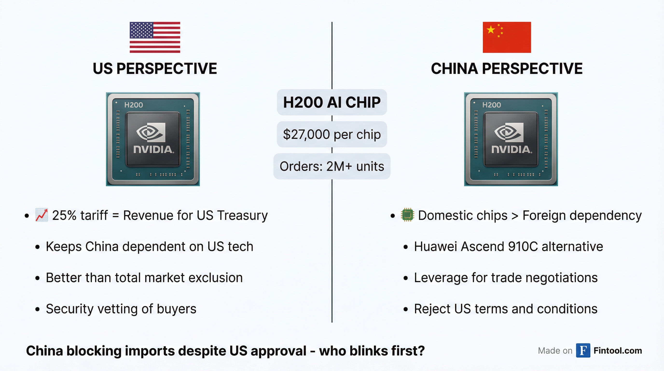 Industrial Policy: China is aggressively pursuing self-sufficiency in AI chips. Huawei's Ascend 910C—now shipping at scale—represents the domestic alternative. Allowing massive H200 imports would undermine that strategy and keep Chinese AI companies dependent on American technology .