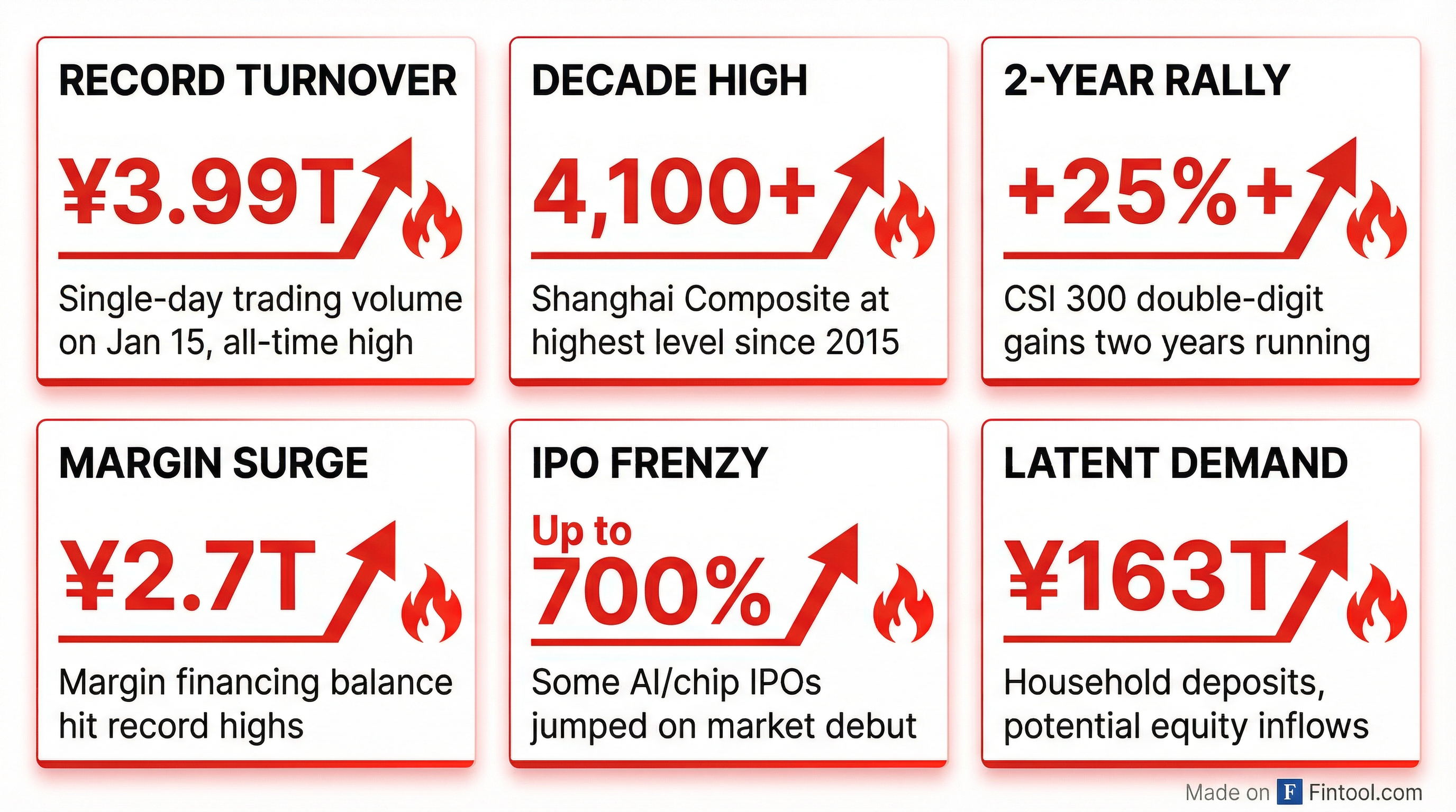 The crackdown comes as the Shanghai Composite Index hovers above 4,100 points—a decade high—while single-day turnover hit a record ¥3.99 trillion ($556 billion) last week. The CSI 300 has now posted double-digit gains for two consecutive years, with AI and semiconductor stocks driving a speculative frenzy that has seen some IPOs surge as much as 700% on their market debuts.
