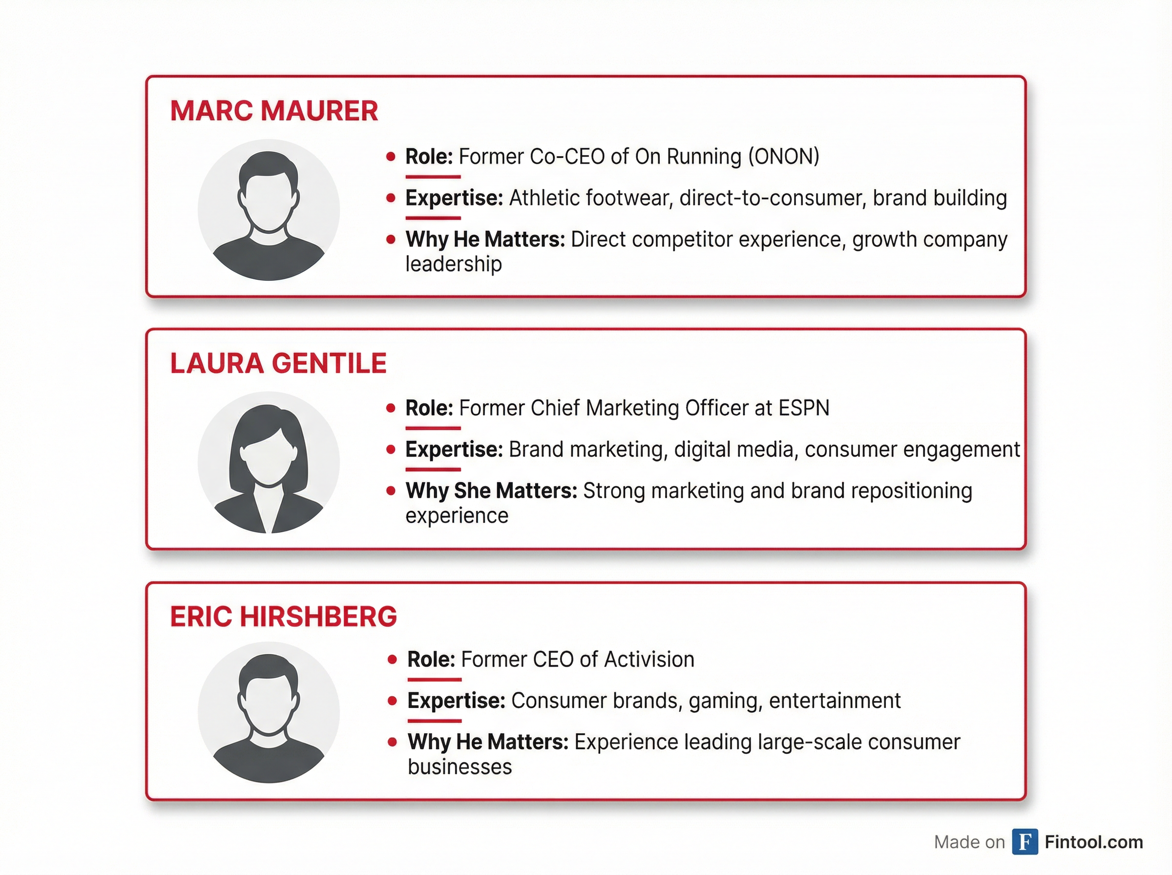 The Maurer nomination is particularly pointed: On Running has been eating Lululemon's lunch, stealing market share from the incumbent while posting 64% revenue growth and building a devoted Gen Z following—exactly the demographic Lululemon has struggled to retain.