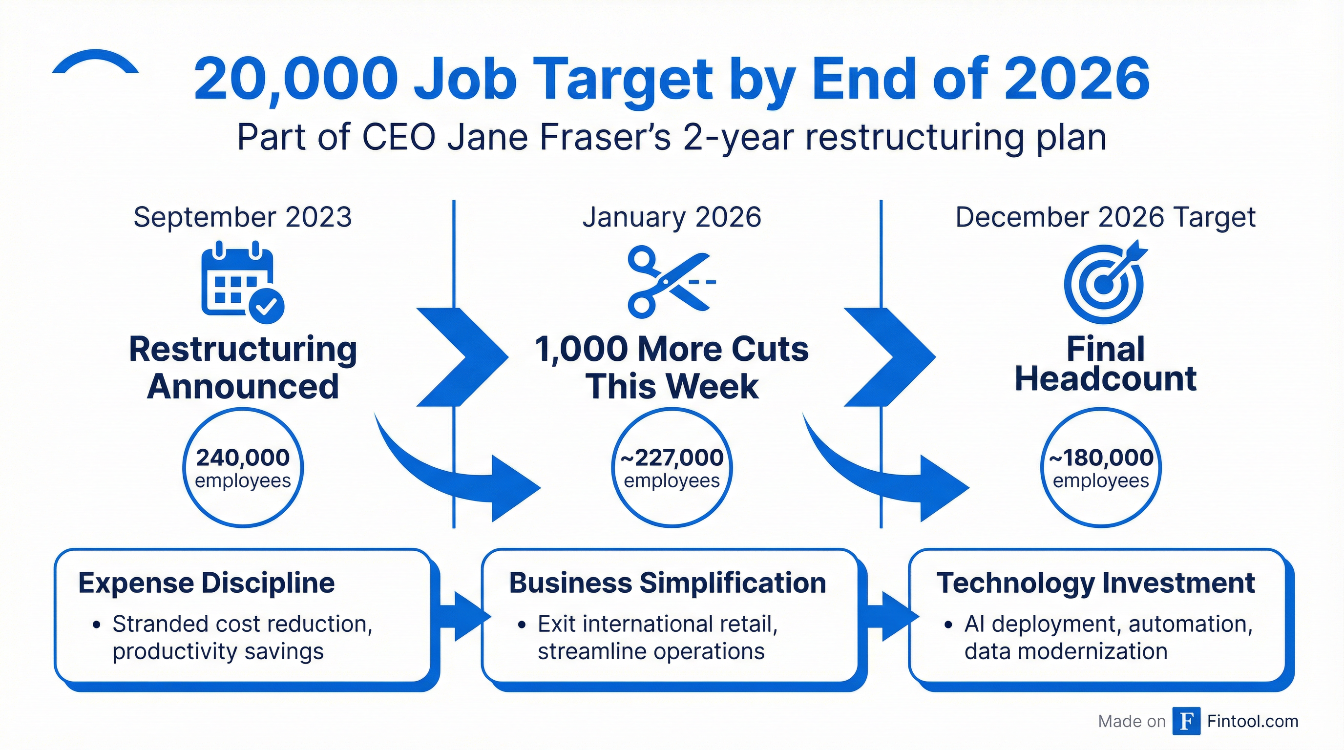 The cuts bring the bank closer to its target of reducing headcount by 20,000 positions by the end of 2026—a goal set when Fraser announced the reorganization in September 2023. With about 227,000 employees at the end of September, Citigroup still needs to eliminate several thousand more workers this year to reach the approximately 180,000 target.