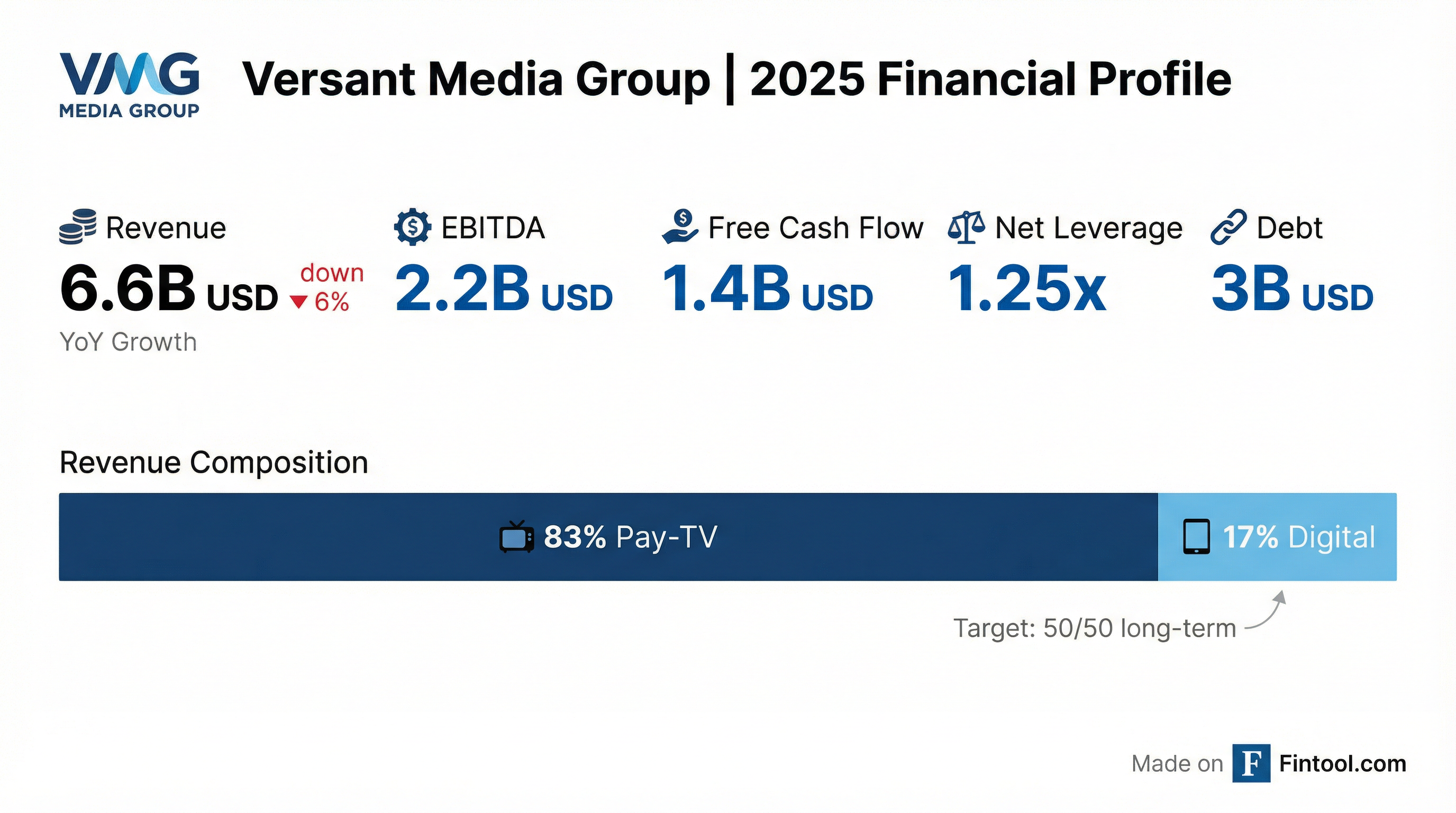 The silver lining: Versant launches with a conservative balance sheet—$3 billion in gross debt, $750 million in cash, and net leverage of just 1.25x—giving management flexibility to pursue acquisitions and invest in growth initiatives.
