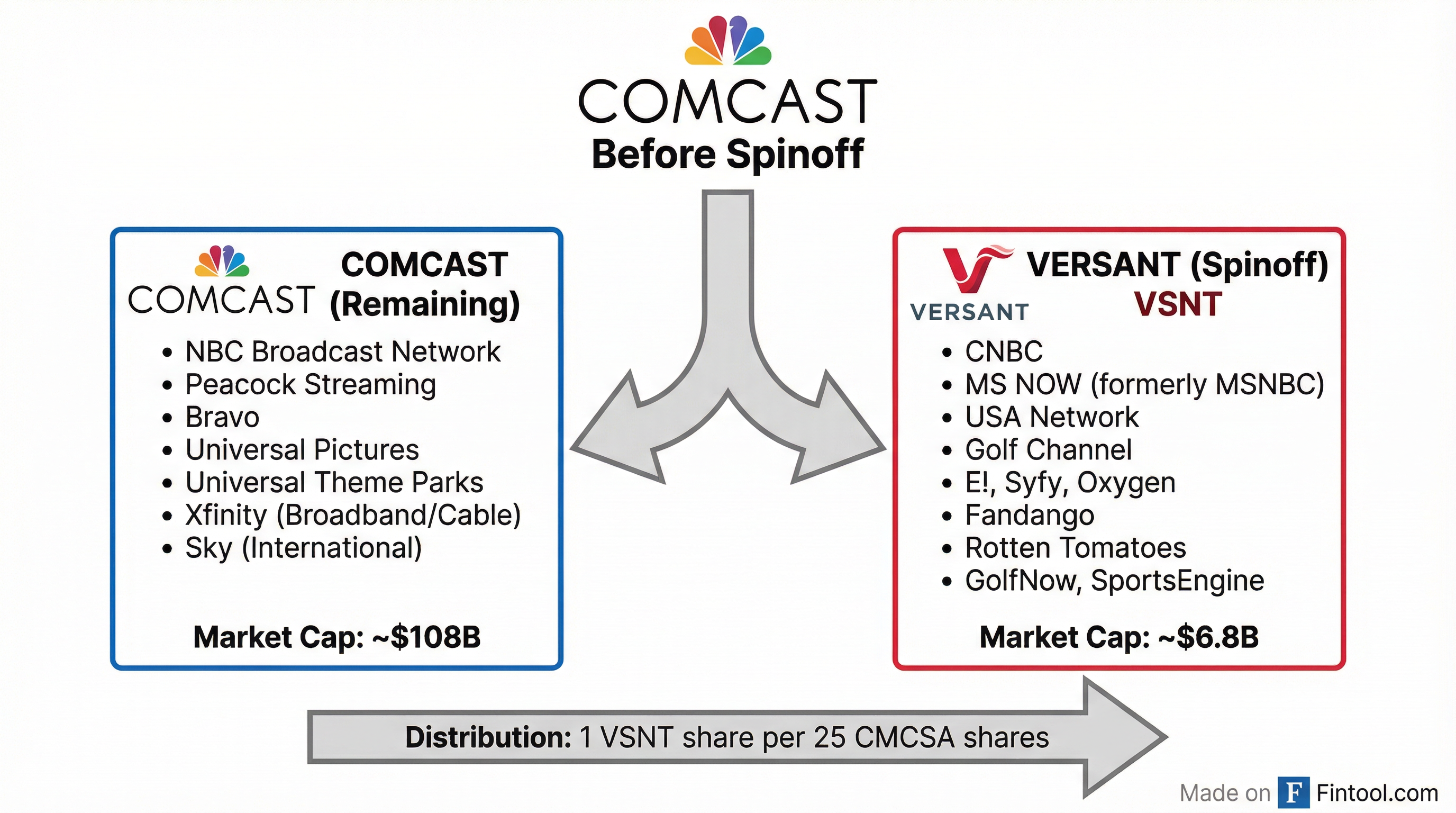 For Comcast shareholders, the spinoff creates a tracking opportunity: own Versant for cash flow and potential consolidation optionality, while the remaining Comcast focuses on growth in streaming, theme parks, and connectivity.