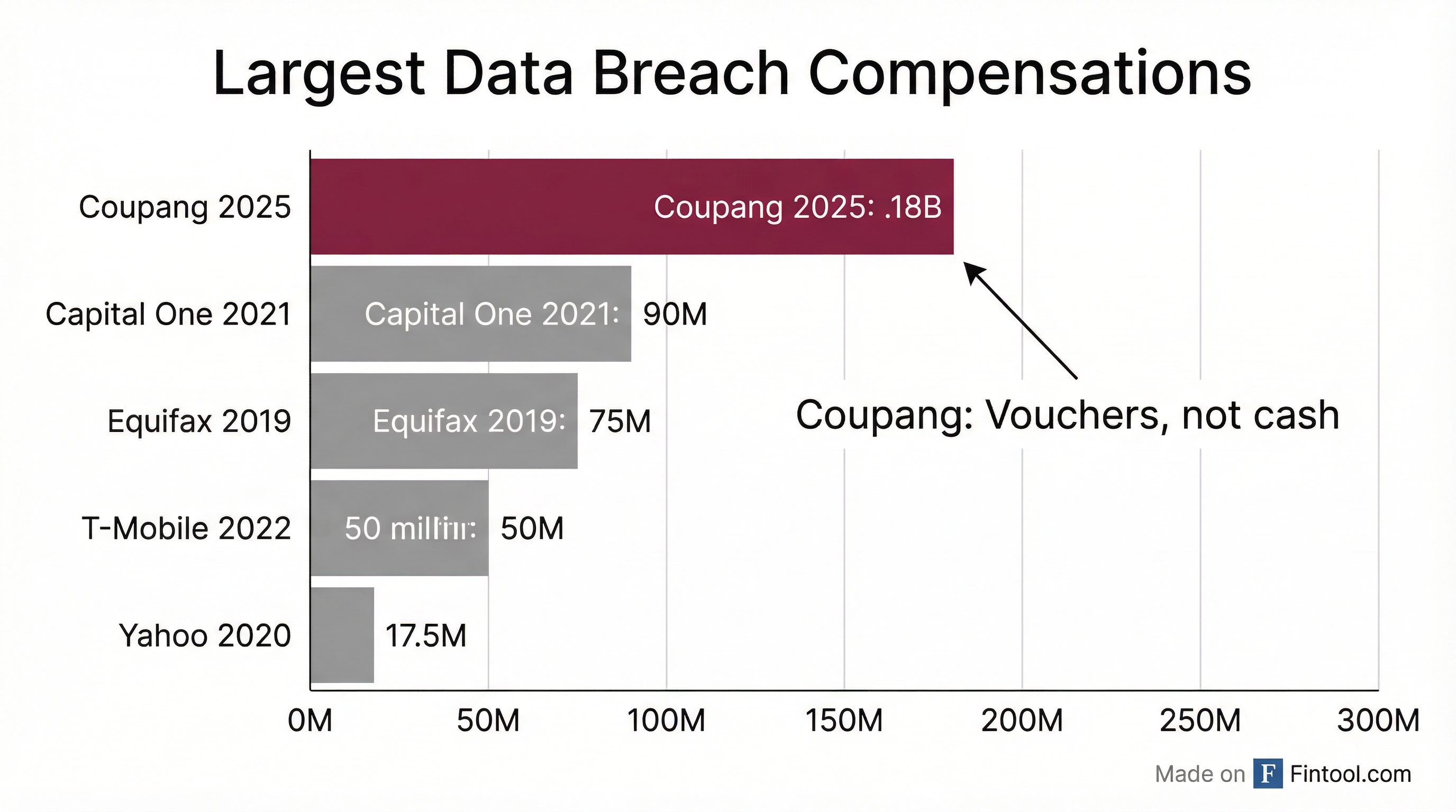 By headline dollar value, Coupang's compensation package dwarfs previous data breach settlements. But the comparison is misleading. Major U.S. settlements—Equifax's $575 million in 2019, T-Mobile's $350 million in 2022—were cash payments to affected consumers and regulatory bodies. Coupang's package is company scrip that requires continued engagement with the platform.