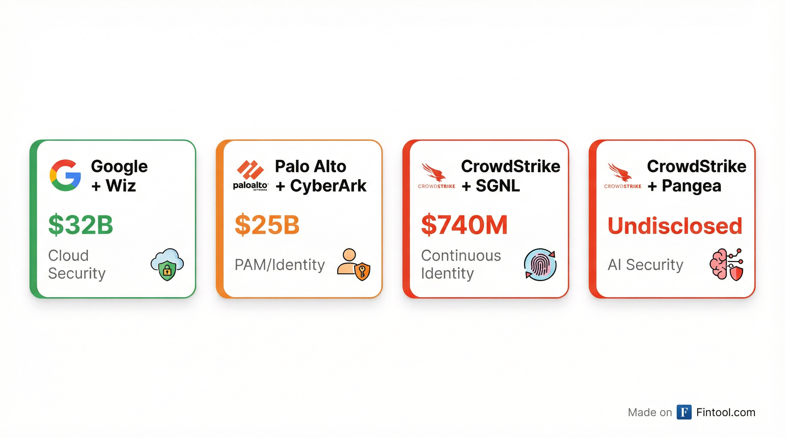 - Palo Alto Networks-0.93% acquired CyberArk for $25 billion in 2025, its largest deal ever, to compete directly in privileged access management