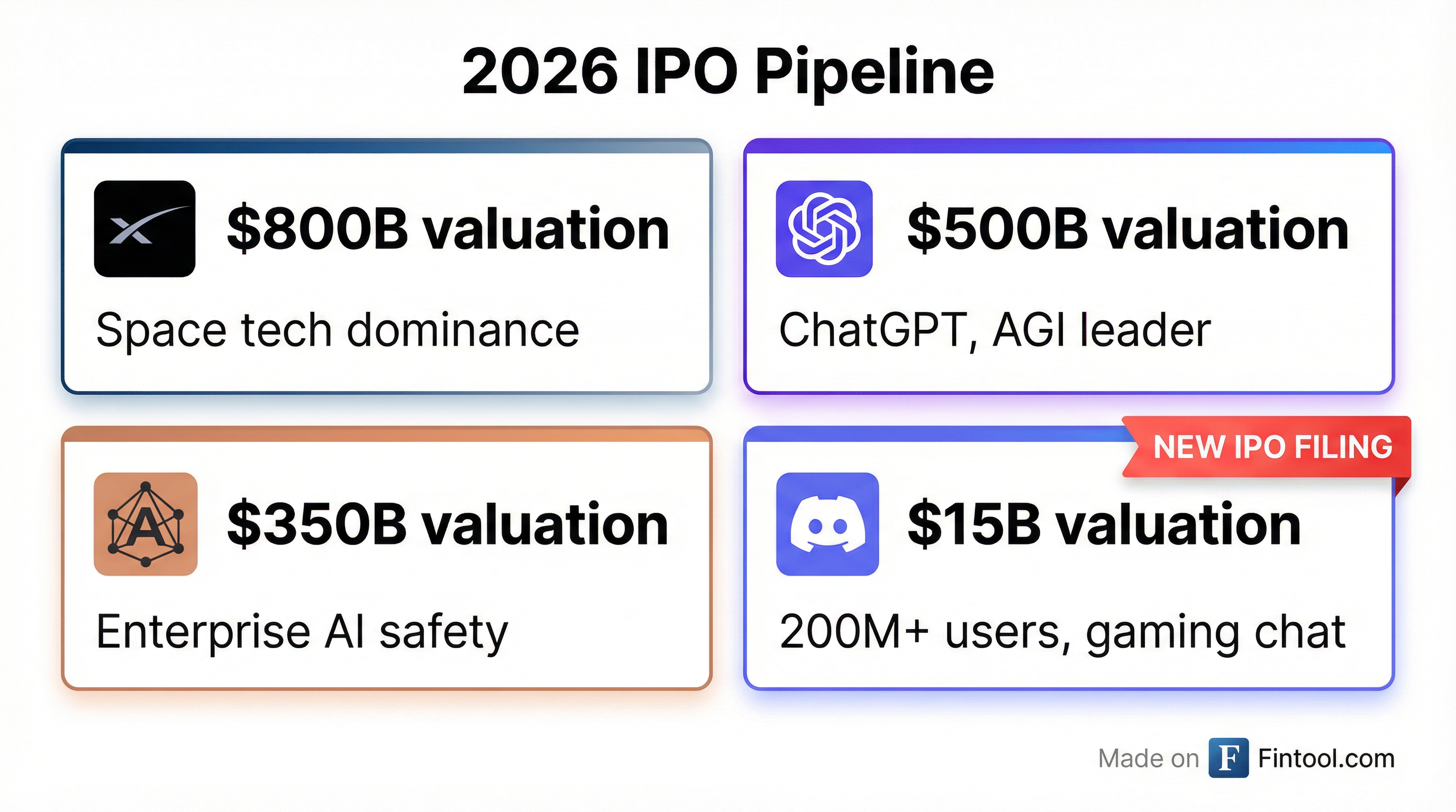 | SpaceX | $800B | Confirmed for 2026 | Space tech monopoly, Starlink |