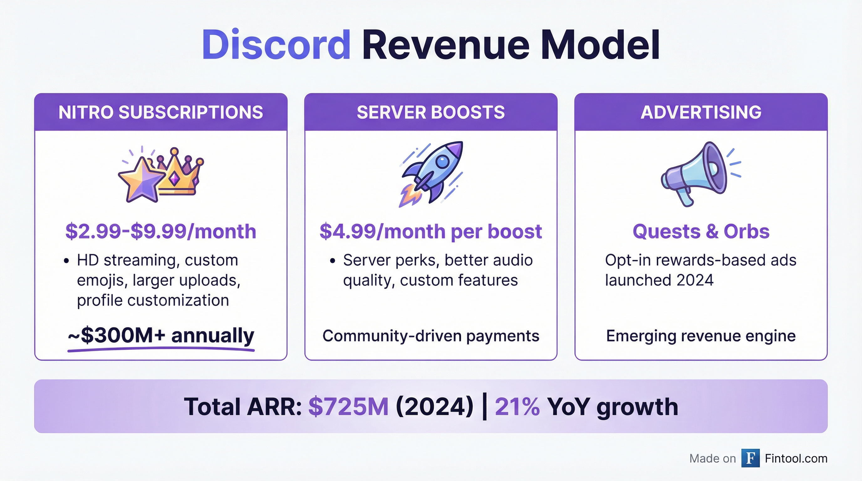 The dramatic revenue acceleration between 2022 and 2023—a nearly 3x jump—reflects Discord's expansion of monetization beyond its core Nitro subscription product. The launch of advertising products in 2024, including "Sponsored Quests" and "Video Quests" that reward users for engaging with brand content, has added a second growth engine.