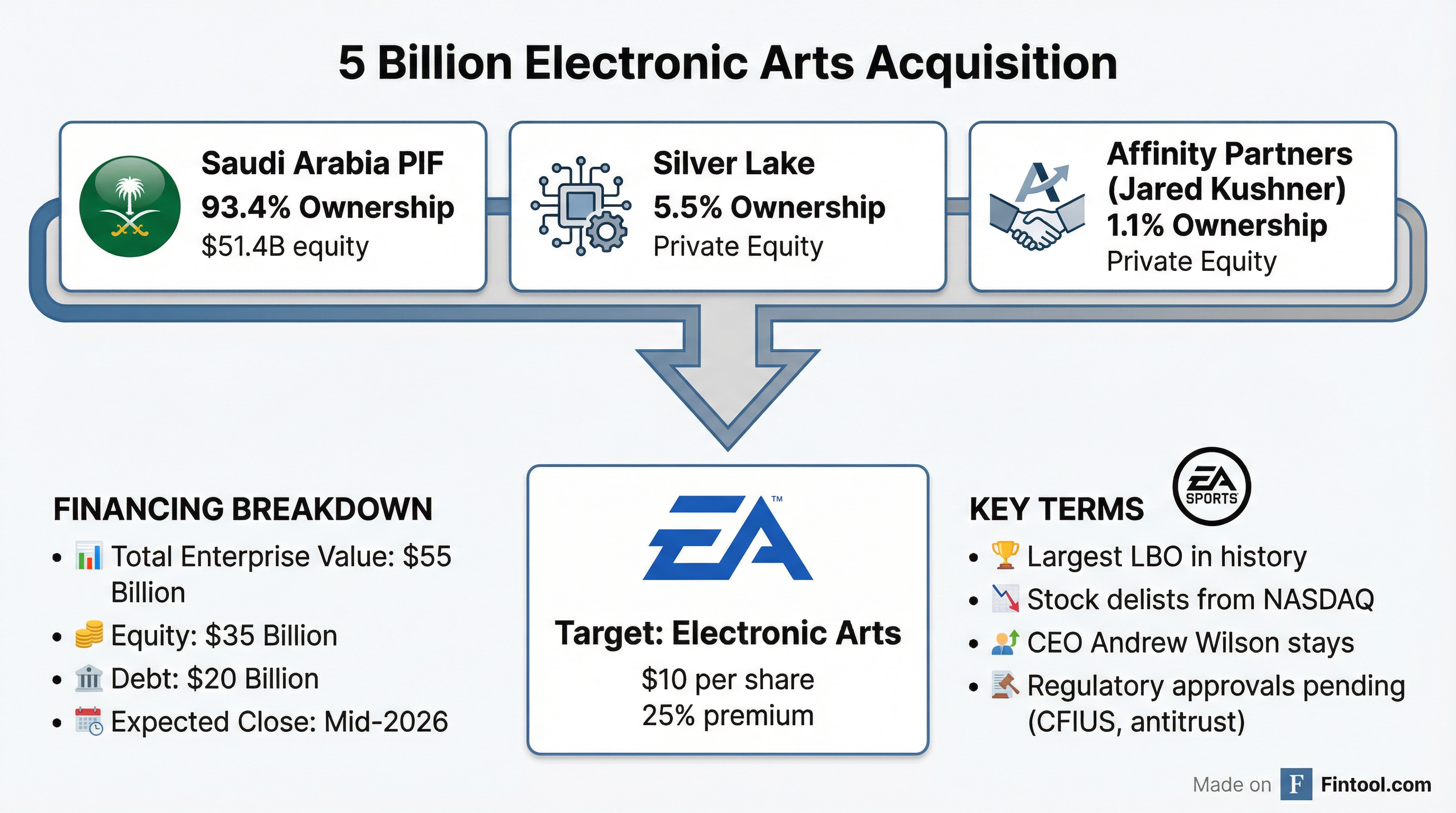The acquisition values EA at approximately $55 billion, including debt. Upon closing, Saudi Arabia's PIF will own 93.4% of the company, with Silver Lake holding 5.5% and Jared Kushner's Affinity Partners taking 1.1%. PIF already owned approximately 24.8 million shares of EA prior to the deal announcement—a stake that will be rolled into the new ownership structure rather than cashed out.
