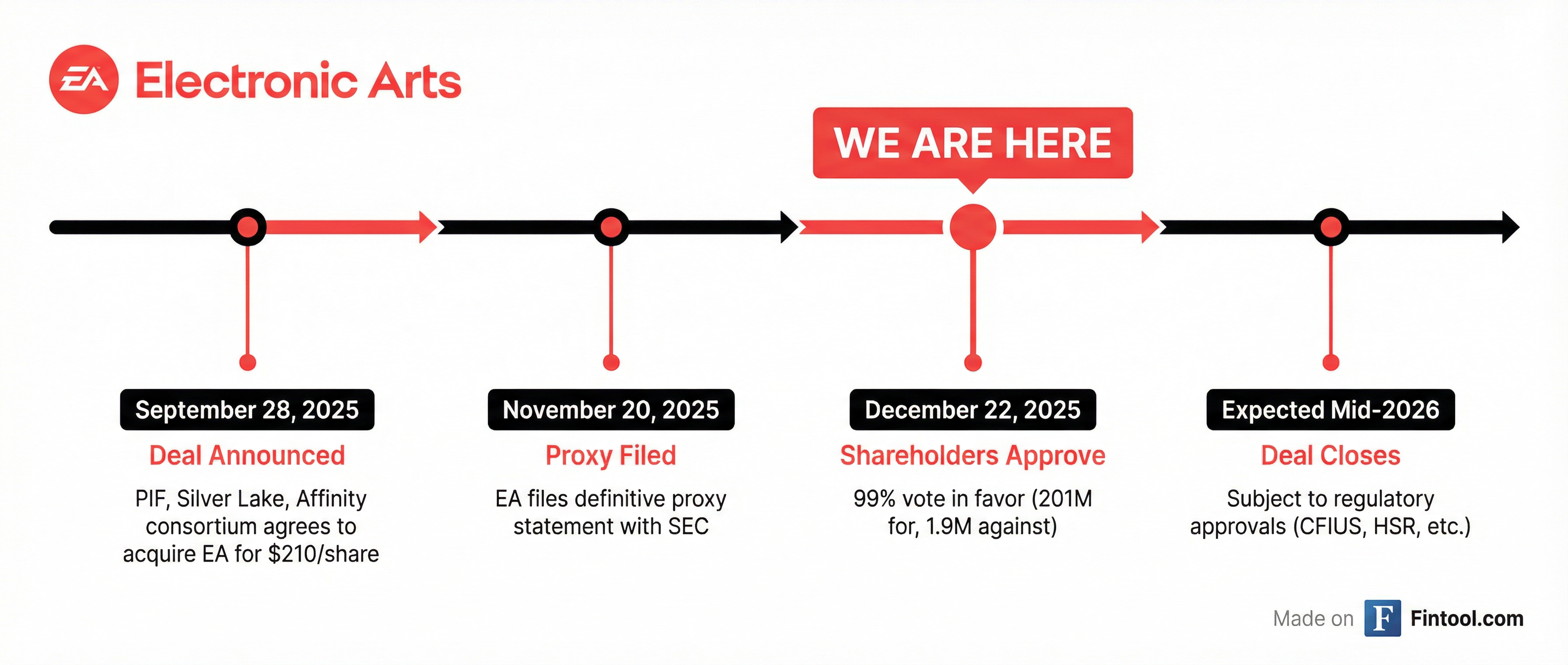 The vote wasn't close. Of the 250.1 million shares entitled to vote, 201.5 million were cast in favor—representing 99% of shares present and voting—versus just 1.9 million against and 90,000 abstentions. The lopsided margin reflects the significant premium shareholders are receiving: $210 per share in cash, a 25% premium to EA's unaffected trading price before the deal was announced in September.
