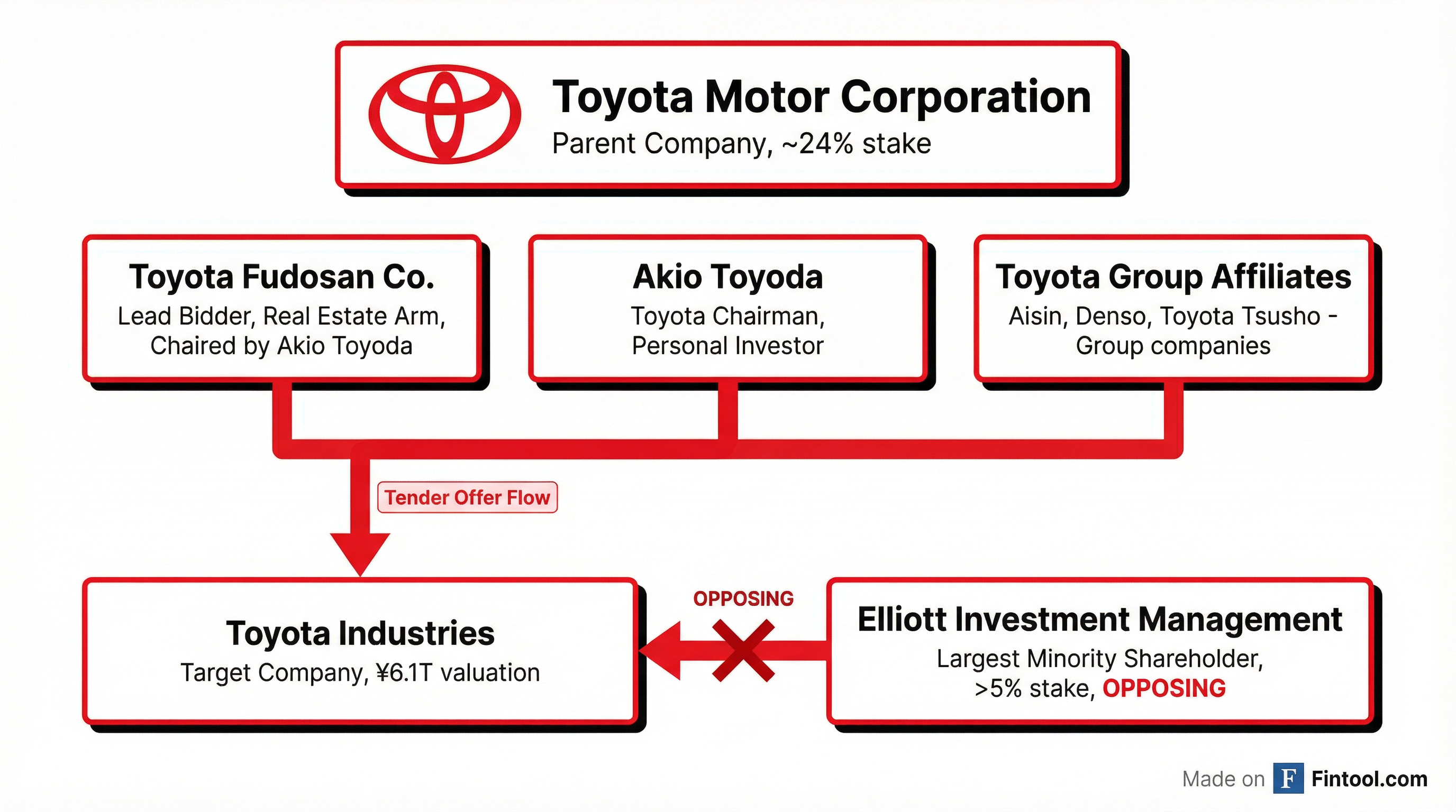 The take-private is being led by Toyota Fudosan Co., a privately held real estate arm chaired by Toyota-0.39% Motor Chairman Akio Toyoda. The bidding consortium includes Toyota Motor itself (which holds approximately 24% of Toyota Industries) along with group affiliates Aisin, Denso, and Toyota Tsusho.